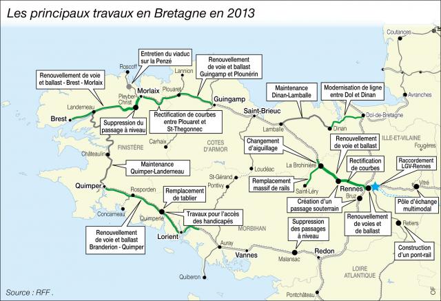 article le Télégramme 28/1/2013 http://www.letelegramme.com/ig/generales/regions/cotesarmor/le-point-sur-le-trafic-d-aujourd-hui-28-01-2013-1985624.php la voie 1 a été réouverte à la circulation en Voie Unique Temporaire VUT passage des trains à 10km/h à hauteur de la falaise éboulée Seuls les TER circuleront de Morlaix à Brest les TGV sont limités à Morlaix + service de cars