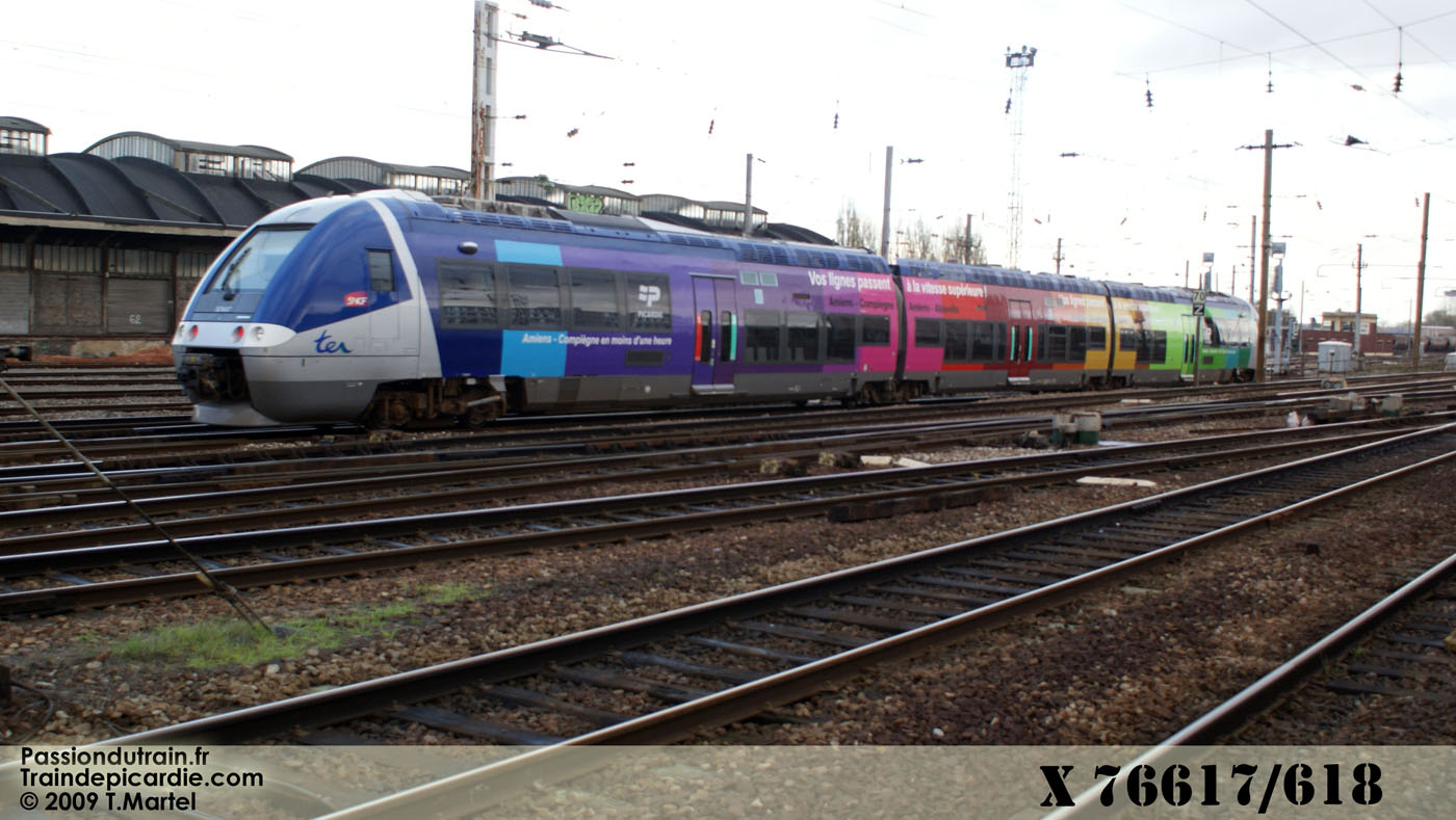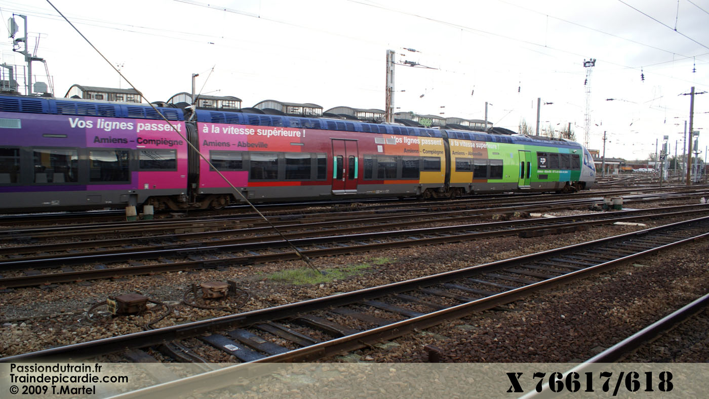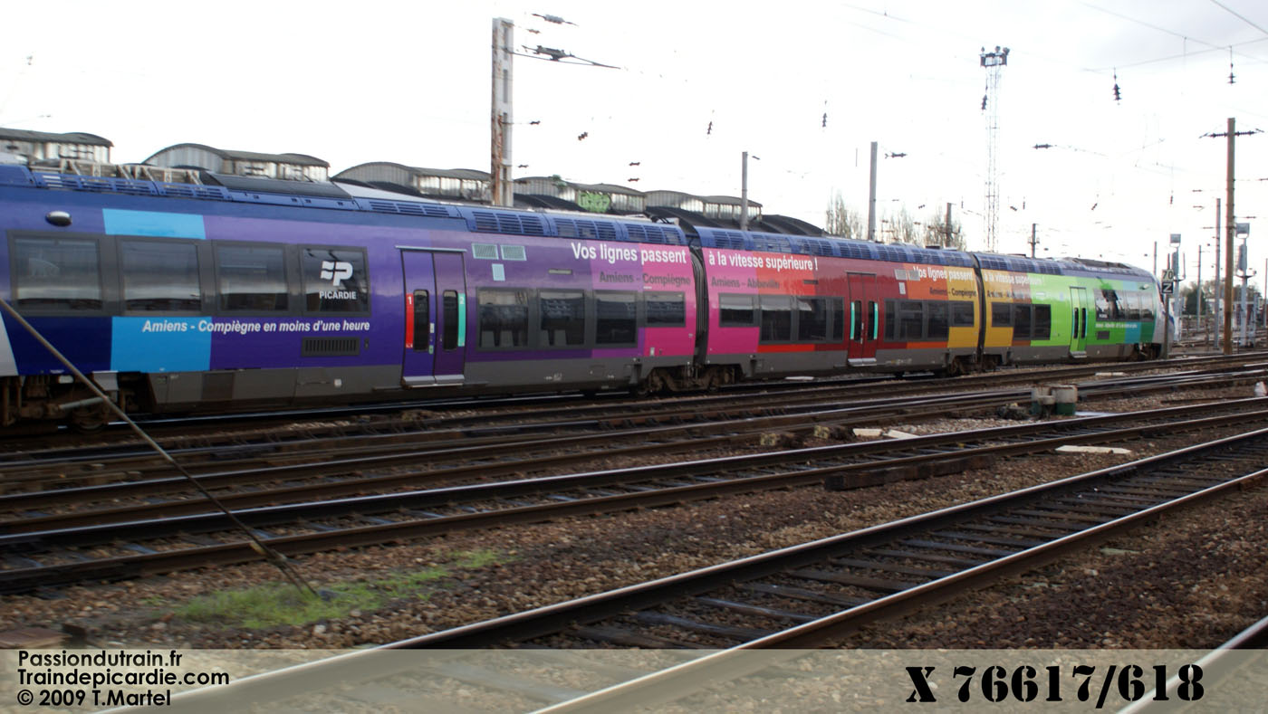 La rame X76617/618 des TER Picardie, baptisé "Le Marquenterre" à changé son pelliculage. Voici quelques clichés (prise sous la pluie)