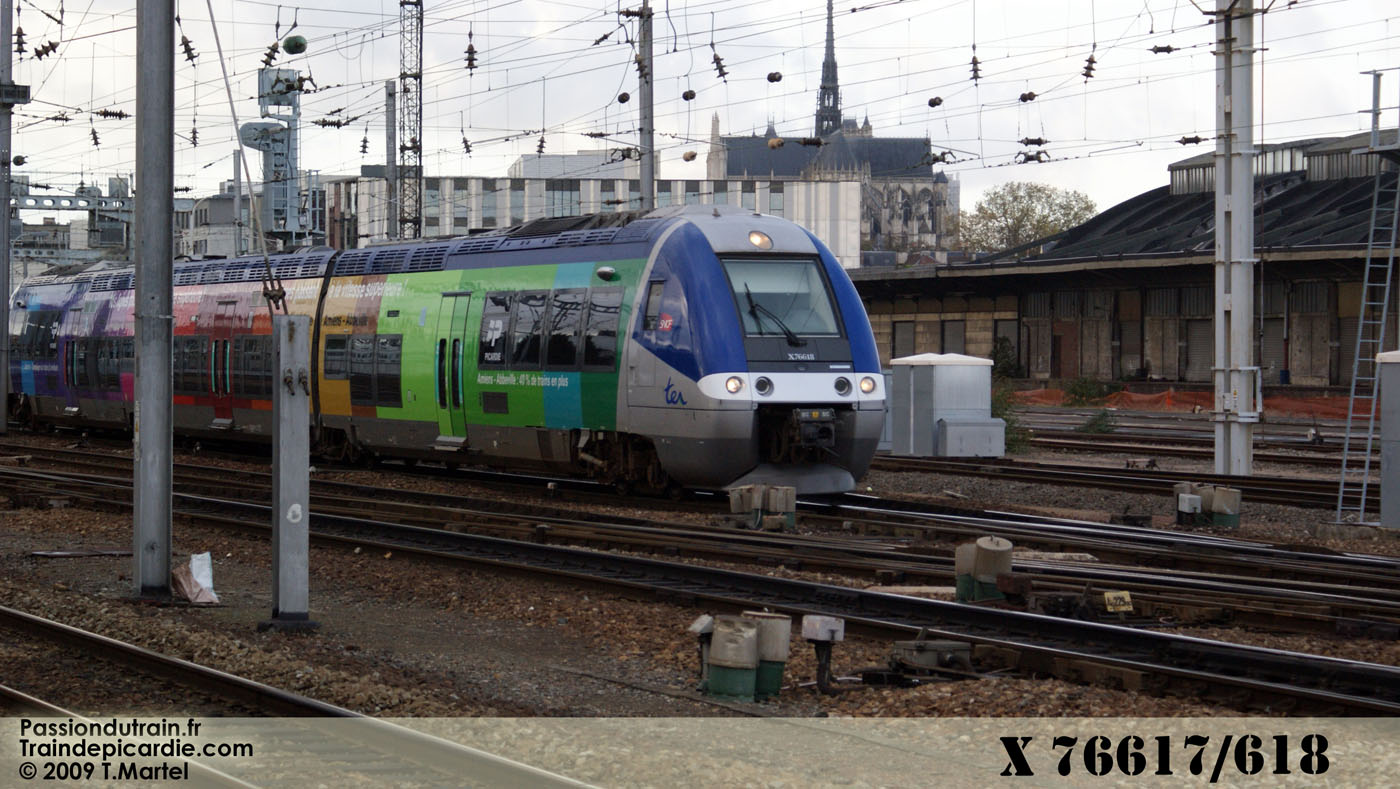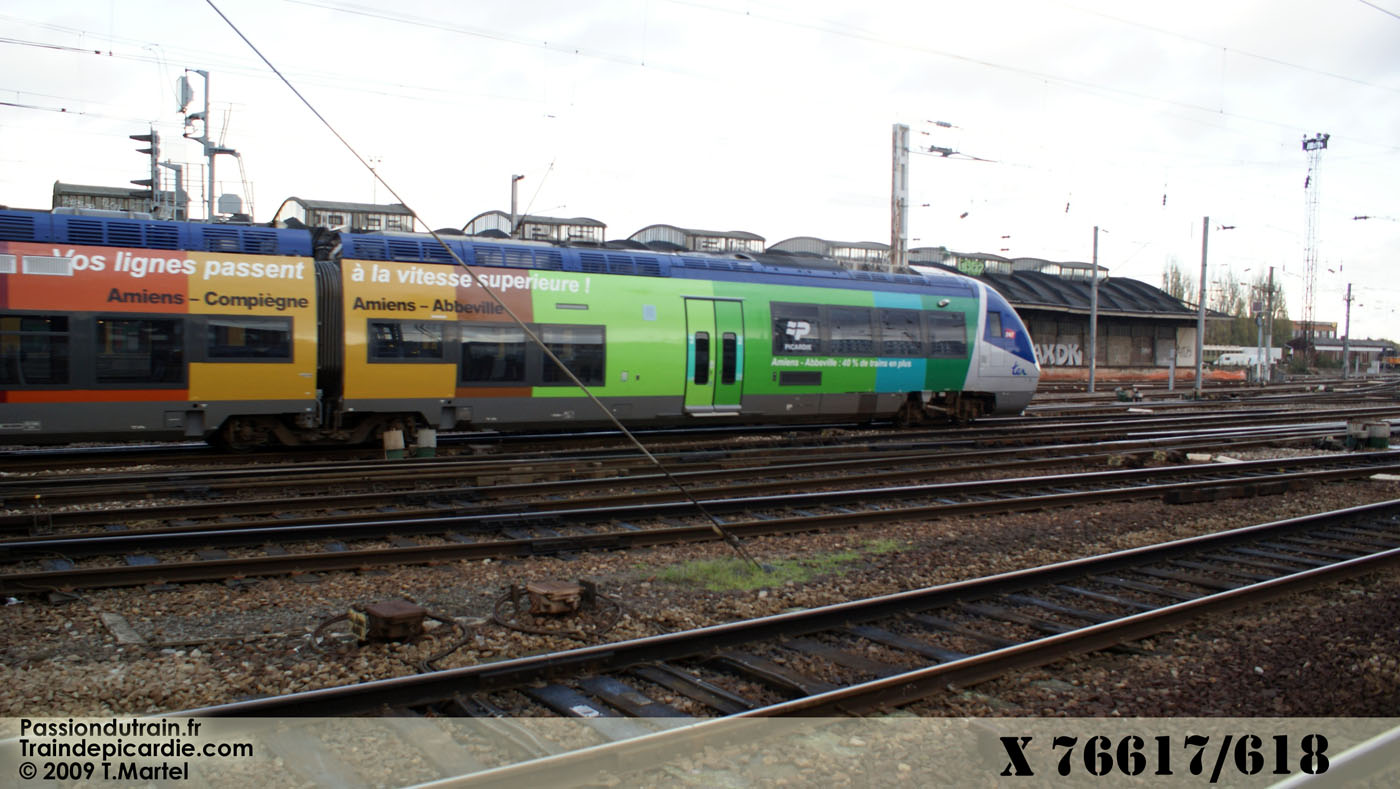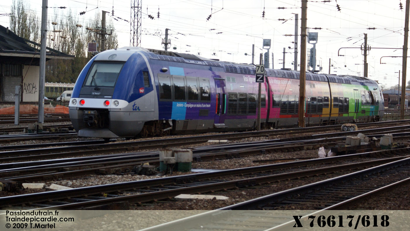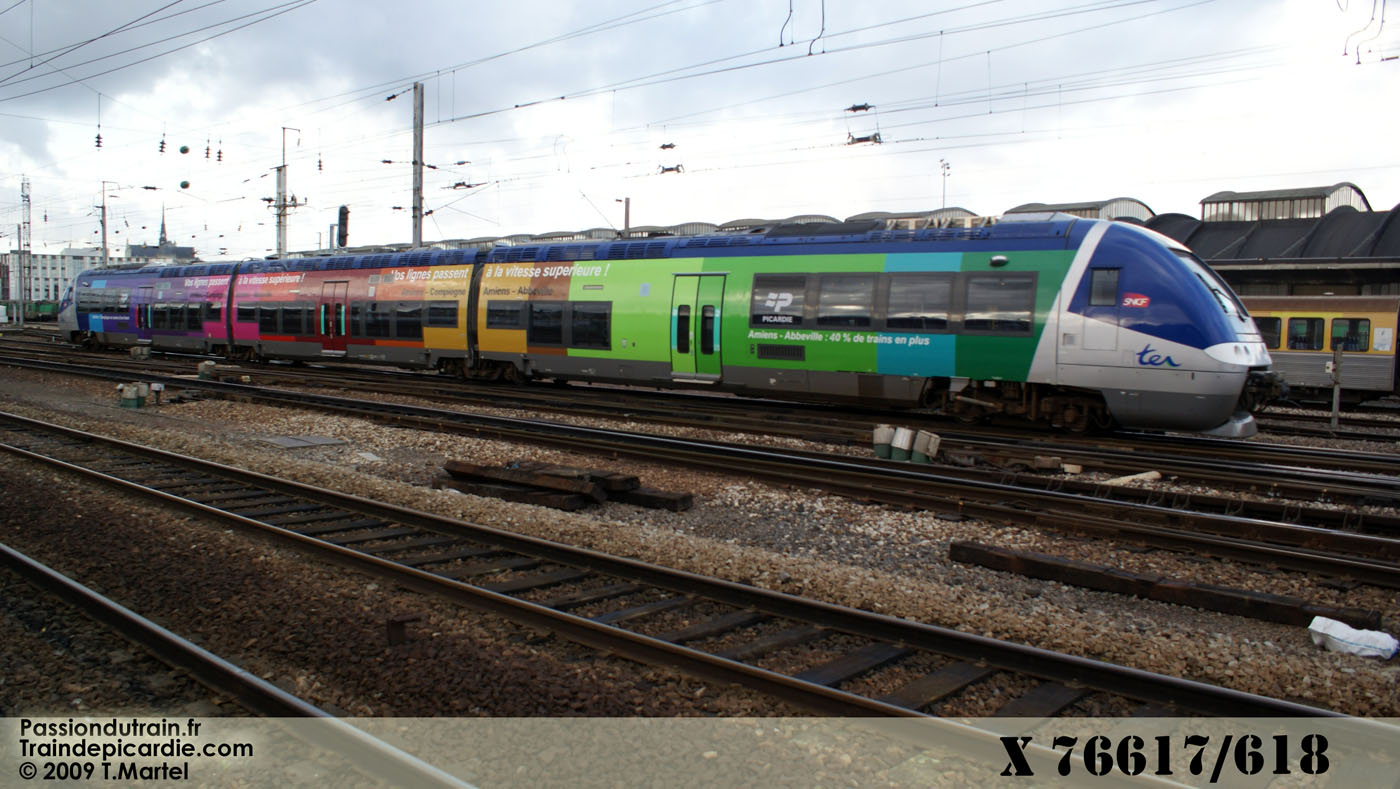 La rame X76617/618 des TER Picardie, baptisé "Le Marquenterre" à changé son pelliculage. Voici quelques clichés (prise sous la pluie)