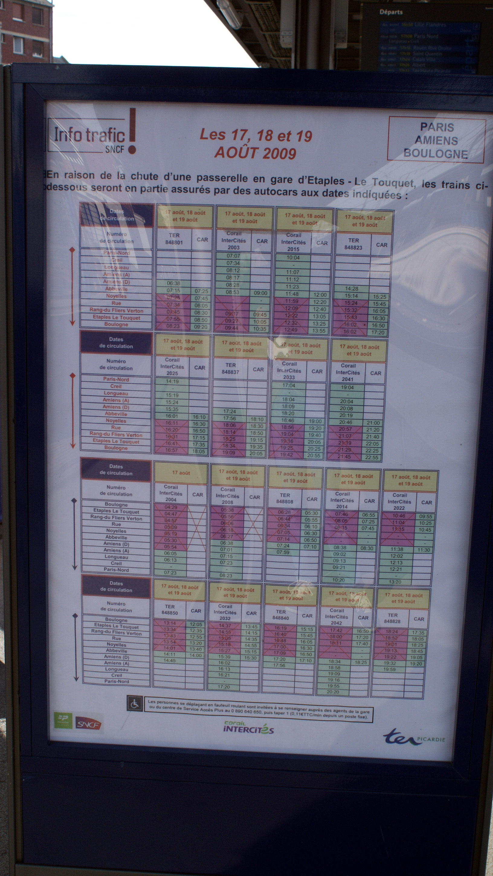 grrrr pas sérieux Nico !!! Bon ben! je fait essayer de relater ou mieux encore, une revue de presse [15-08] Pas-de-Calais: un mort, trois blessés dans l'effondrement d'une passerelle SNCF à Etaples (voix du Nord) http://www.lavoixdunord.fr/France_Monde/Br...sses-dans.shtml [16-08] Une passerelle SNCF s'effondre : un ouvrier meurt (Le progrès) http://www.leprogres.fr/fr/france-monde/ar...rier-meurt.html [17-08] Passerelle effondrée : place à l'enquête (texte et vidéo) http://nord-pas-de-calais-picardie.france3...e-56603475.html [17-08] L'ouvrier décédé à Étaples avait décalé ses congés (Voix du Nord) http://www.lavoixdunord.fr/Locales/Valenci...it-decale.shtml [18-08] Pas de train avant jeudi : les usagers en bus http://www.lavoixdunord.fr/Locales/Montreu...sagers-en.shtml Après du côté des gares, j'ai pu constater qu'il y a moins de Corail et en plus, ils sont en retard en venant d'Abbeville. Voici le panneau horaires qui se situe sur le quai d'Amiens