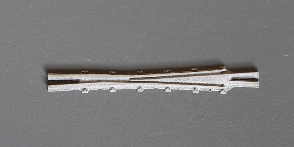 Bonjour à tous, Je suis en train de réaliser les appareils de voie pour mon réseau au 1/160. J'utilise plusieurs technique d'impression 3D en résine (réalisation du plancher), frittage laser de poudre métallique (réalisation du cœur) et micro-usinage classique (réalisation des rails). La première étape consiste à dessiner les ensemble sous forme de fichier 3D. Je dispose de plans de plusieurs types d'appareils (depuis les modèles 1961 jusqu'au modèle 2002) que je simplifie et adapte aux contraintes. Par contre, sur le modèle en cours (appareil UIC60, tangente 0,085 sur pose bois, modèle 88), je suis bloqué. J'ai le plan de pose de l'appareil posé isolément mais je ne connais pas la disposition des bois quand l'appareil est monté en communication avec entraxe de 3,60 m (environ)... situation qui se produit plusieurs fois sur mon réseau. Quelqu'un pourrait-il m'aider sur le sujet (sans vouloir dévoiler de secret...), quitte à me communiquer uniquement le numéro du plan concerné (j'imagine qu'il y a un VA16XXXX-XXX sur ce montage pour ce type d'appareil). Ci-dessous quelques photos de ce que ça donne en modèle réduit Le plancher avec un morceau de rail enfilé au niveau d'un VCC et des coussinets Le cœur Côté pointe avec le moteur, les VCC, coussinets, etc... Merci pour votre aide et @+ Rémy