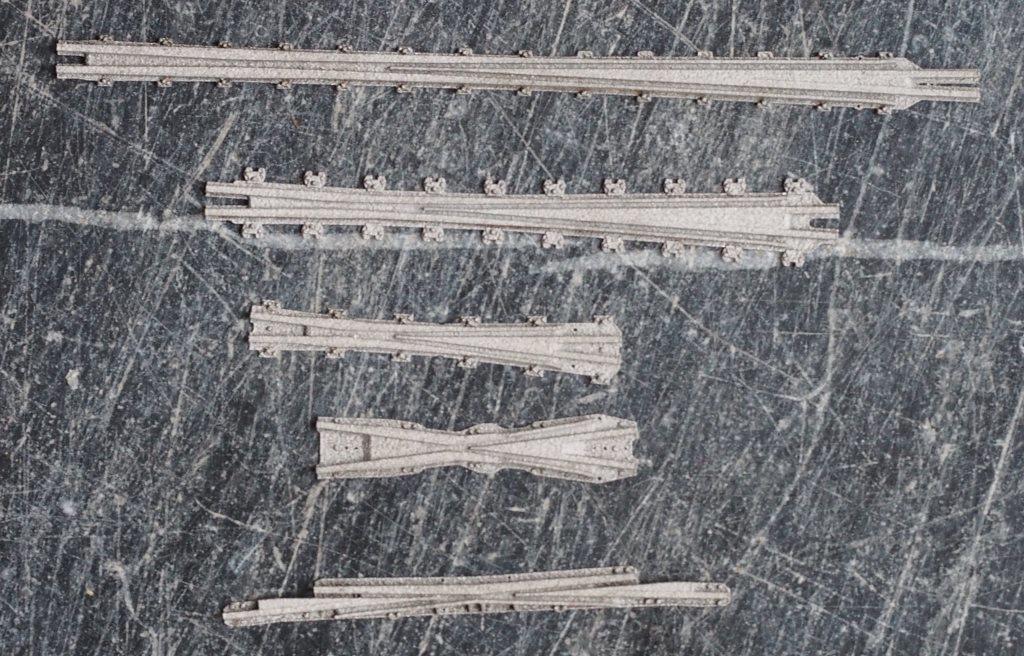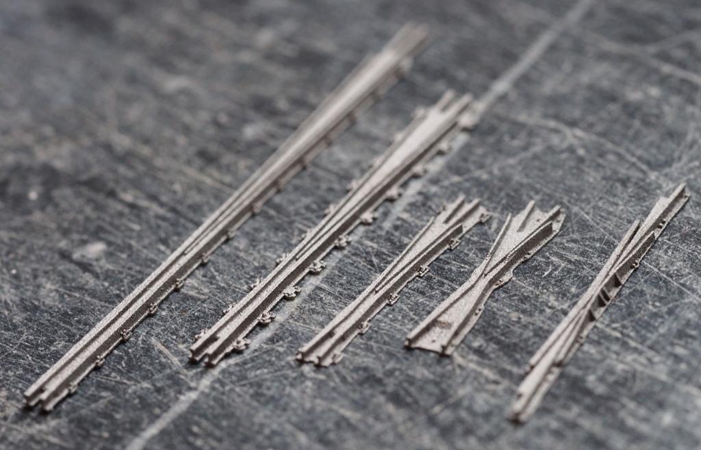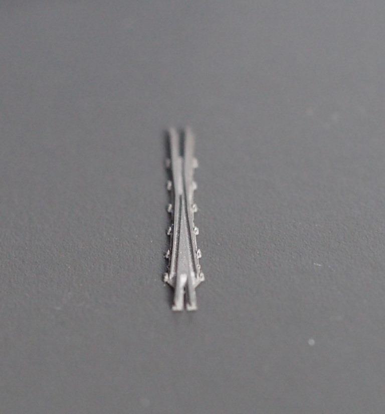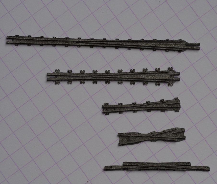 Salut à tous, Et voilà la première fournée de cœurs en acier (réalisés en fusion laser de poudres métallique). J'ai fait faire pour mes besoin une vingtaine de modèles en différents profils. Un petit aperçu ci-après avec de haut en bas : UIC60 - tg 0,05 CàG UIC60 - tg 0,085 CàG U36 - tg 0,13 CàG U50 - tg 0,264 U36 - tg 0,11 TO Encore un petit coup de papier de verre ultra fin (grain 2000) sur la surface de roulement pour lui rendre son aspect brillant et le tour est joué ! Maintenant, va falloir saboter de la traverse de 1,5 mm, graver selles et attaches et monter des ADV @+ Rémy