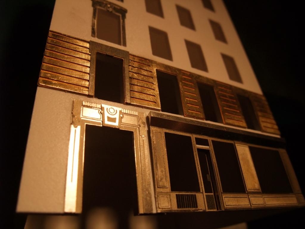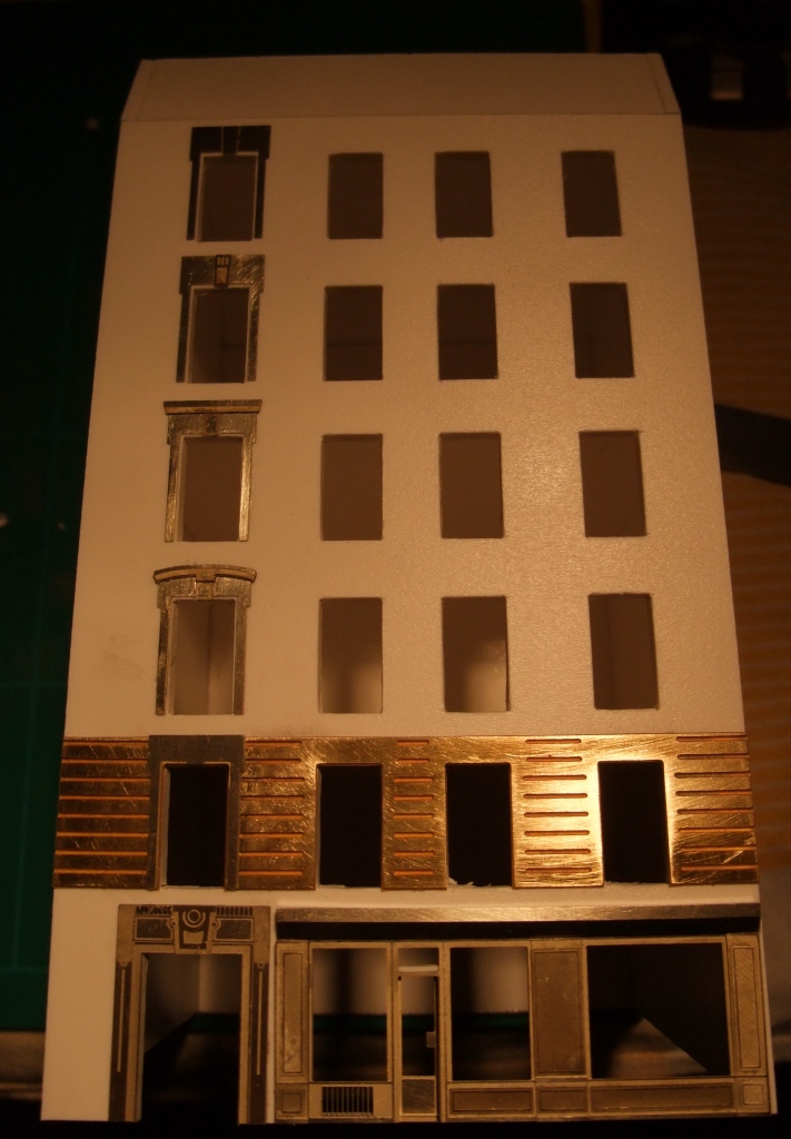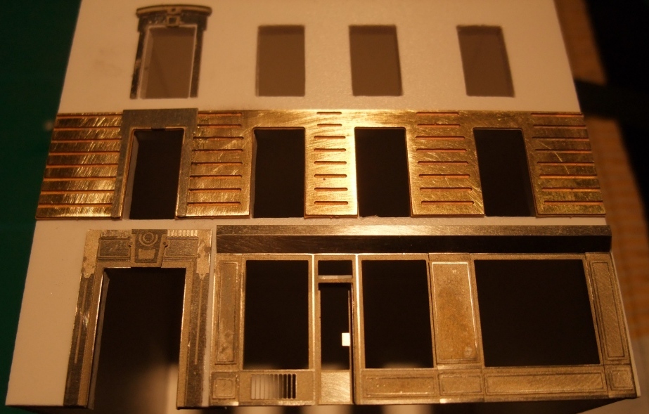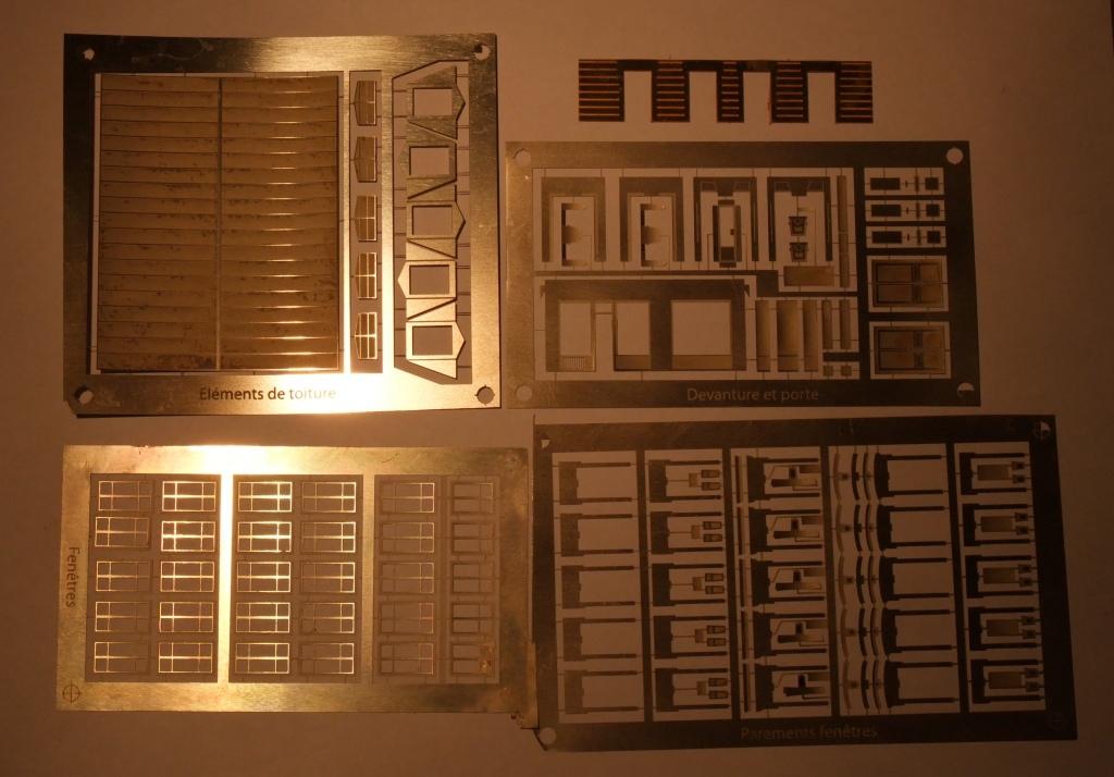 Et voilà, La gravure a été un peu laborieuse car j'ai utilisé des vieilles plaques dont la résine est un peu récalcitrante et je me suis loupé sur le temps d'insolation de la première Bref, j'ai quand-même pu graver tout ce que j'avais prévu pour agrémenter la façade encore un peu nue du bâtiment. Voilà le volume du bâtiment (réalisé en forex, sorte de plaque de PVC) : Et les plaques de maillechort et laiton fraîchement gravées. L'assemblage va pouvoir commencer. @+ pour le montage Rémy