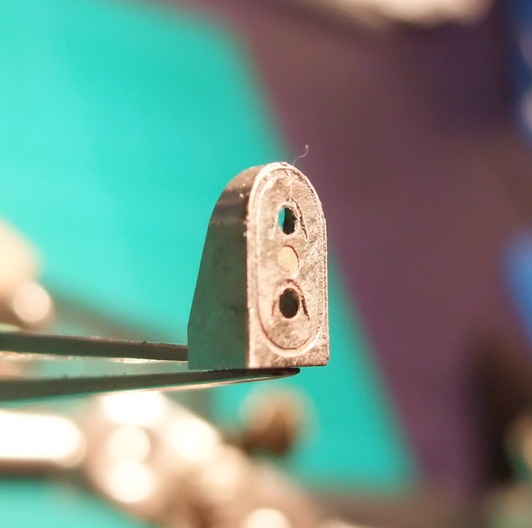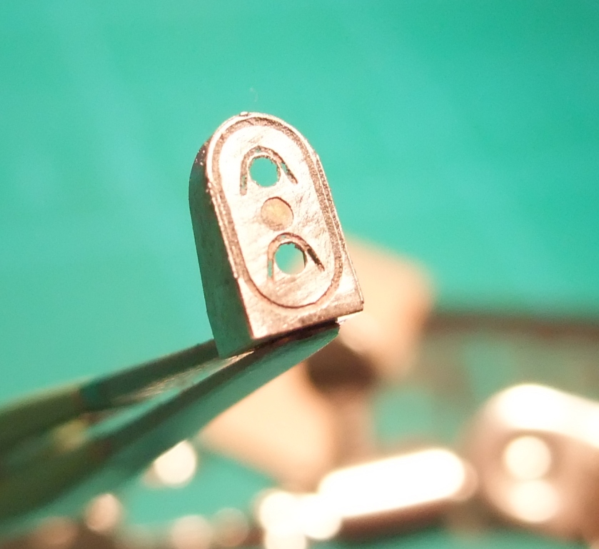 Eh ! Eh ! Merci CRL Cool ! Si, justement, je suis sous antibiotiques ... mais c'est pas pour ma ferrovipathie... simplement une saleté de coup de froid En attendant, pour commencer mes assouplissements de papattes, je suis en train de me fabriquer un petit carré violet châssis-écran sur mât droit allégé (modèle 1967). J'en suis au stade ou je regarde la conception de la gravure de la cible et du mât. Voici le résultat pour la cible (le poil de c... sur la deuxième photo, je l'avais pas vu au moment de la prise ... la cible fait moins de 4 mm de large). C'est presque bon : un petit ergot à rajouter pour faciliter le calage au moment de plier et souder. Il faut également que je reprenne de quelques 1/10 de mm la largeur des visières (non montées ici). Aujourd'hui, je vais essayer de monter le mât pour voir ce que cela donne. @+ Rémy