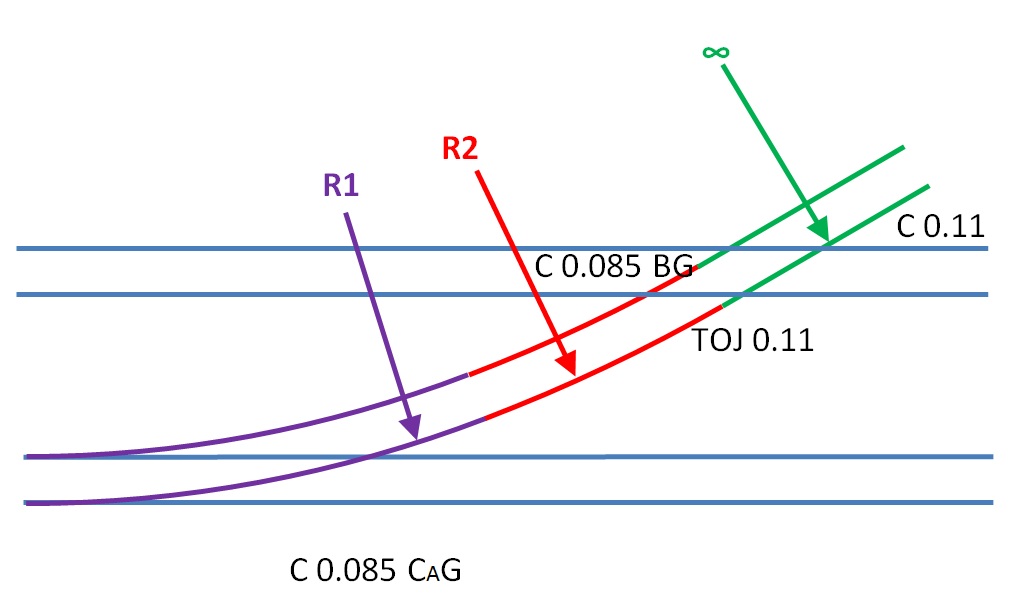 Salut ! Effectivement, la traversée étant combinée, la voie intermédiaire est forcément courbe entre le coeur de bifurcation et le coeur de traversée. Mathématiquement, si l'entrevoie est connue, alors le rayon R2 peut être connu de manière unilatérale. Le problème est que je ne connais pas l'entrevoie dans ce cas (est ce qu'une telle bifuraction peut être implantée avec entraxe de 3,57 m par exemple ?). Ce que j'imagine à partir du cas en rail U50 (toujours avec une traversée combinée 0,085-0,11-0,11), c'est que le rayon R2 est identique sur toute la longueur de voie qui comprend le coeur de bifuraction et la voie intermédiaire jusqu'au coeur de traversée. Comme le coeur de bifurcation ne doit exister qu'en 2 versions (UIC60-0,085BG ou UIC60-0.085BD) avec un rayon bien déterminé, j'imagine que ce rayon du coeur correspond aussi au rayon de la voie intermédiaire. Bon, je vais faire 2-3 calculs avec 3,57 d'entraxe pour voir ce que cela donne. @+ Rémy