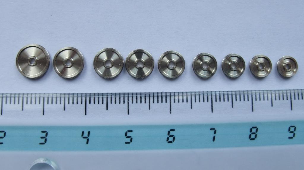 Salut à tous, Les choses se précisent et les roues commencent à prendre le chemin de la maison. Voici quelques photos prises avant expédition. Il s'agit ici de roues de 920 mm, soit 5,75 mm ramené à l'échelle N. "Mes essieux et Mesdames", va y avoir du boulot : pas question de s'en jeter un p'tit derrière la cravate avant d'attaquer l'assemblage @+ Rémy