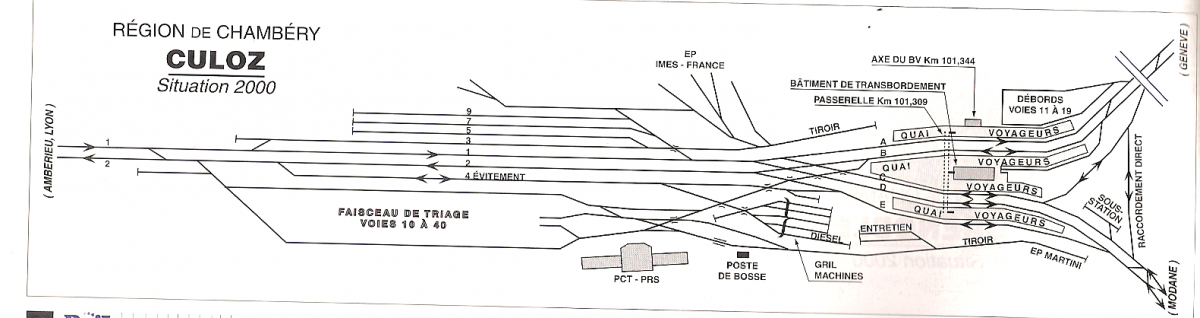 22. Gare de Culoz (situation 2000) Source : page 36 du Rail Passion Hors-série. "Alpes : la prodigieuse épopée du rail" (été 2000).