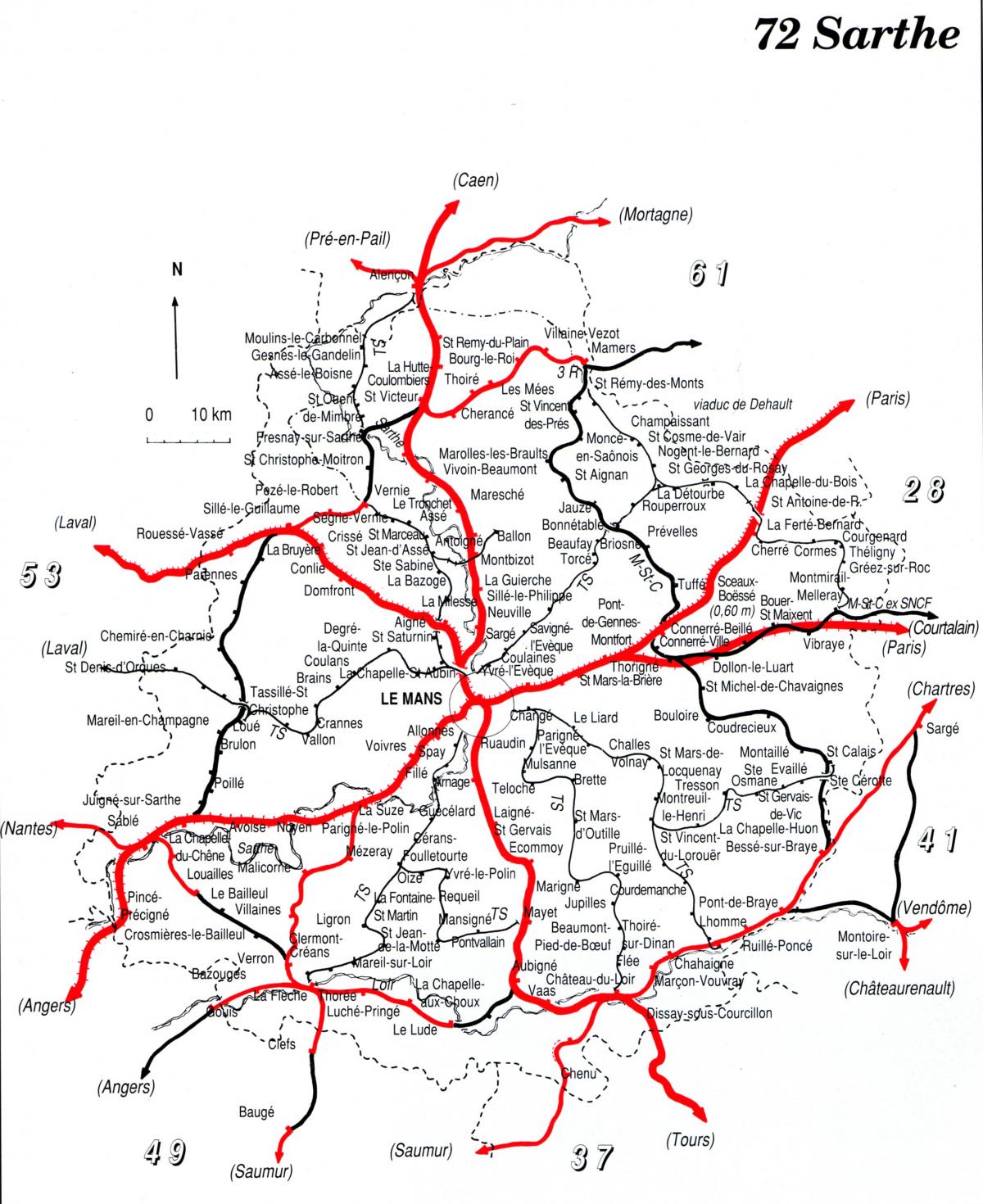 4. Ce n'est pas sur l'ancienne étoile ferroviaire de La Flèche qui comprenait 5 lignes : La Flèche - Malicorne-sur-Sarthe - La Suze-sur-Sarthe (Le Mans) La Flèche - Crosmières-Le Bailleul - Sablé-sur-Sarthe La Flèche - Bazouges-sur-le-Loir - Durtal - Saint-Barthélémy (Angers) La Flèche - Baugé - Vivy - Saumur La Flèche - Le Lude - Aubigné-Racan ni sur l'ancienne ligne des tramways de la Sarthe : La Flèche - Foulletourte - Le Mans Ce n'est pas Segrie-Vernie non plus. Carte ferroviaire de la Sarthe Source : l'excellent site de Rémy Sarrade Rue du petit train