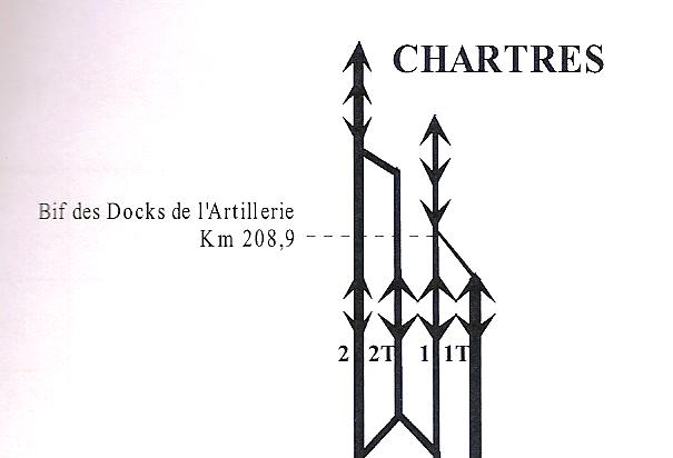 Fin LGV Bretagne mais aussi Pays de la Loire La section Bifur Connerré-Beillé Sud - Le Mans km 208 + 900 (Bifur des Docks de l'Artillerie) est effectivement autorisée à 220 km/h Depuis la mise en service du TGVA tous les PN de cette section ont été supprimés La demande d'ouverture d'un PN momentanément fermé de Champagné par la brigade de gendarmerie de Saint-Mars la Brière a causer le décès du pilote manceau Jean Rondeau le 27 décembre 1985 La bifur des Docks de l'Artillerie . . . La voie 1 T : direction le triage du Maroc et Tours (Raccordement de Pontlieue) La voie 2 T : en provenance de Tours et du triage du Maroc (Raccordement de Pontlieue) Elle sert notamment de sas pour "réorienter" occasionnellement les machines à vapeur