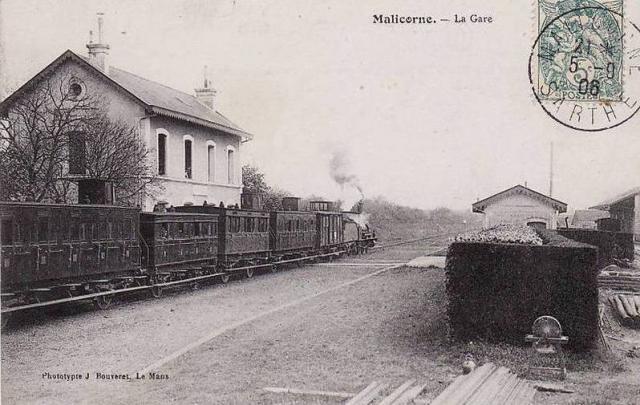 20. Au pays des faïenceries d'art et du Prytanée national militaire. (Le Mans) La Suze-sur-Sarthe - Malicorne - La Flèche (30,100 km) Son point culminant (PK 337 + 500) se situait entre Villaines-sous-Malicorne (PK 339 + 100) et la bifur de l'Aubinière (PK 336 +400). Déclivités maximales des rampes et pentes : 15 ‰. Mise en service par la Compagnie du PO : le 24 décembre 1877. Fermeture au service voyageurs : le 6 avril 1970. Fermeture au service du fret : milieu des années 90. A La Suze-sur-Sarthe cette ancienne ligne avait son origine côté Sablé-sur-Sarthe (Angers). La ligne desservait la ville de Malicorne-sur-Sarthe connue pour ses faïenceries d'art et pour son château de RiveSarthe qui était jusqu'en 2001 la propriété des services sociaux de la SNCF. Ce château qui proposait notamment des séjours à l'intention des enfants du personnel, ainsi qu'aux retraités, des stages de moniteurs de manœuvre, était réputé pour sa bonne cuisine. Le château de RiveSarthe est désormais une propriété privée. A partir de la bifur de l'Aubinière la ligne était en tronc commun avec la ligne 78 en provenance de Sablé-sur-Sarthe . La ligne desservait ensuite La Flèche sous-préfecture de la Sarthe connue pour son célèbre Prytanée national militaire fondé il y a 410 ans (1603) par Henri IV (Collège Royal). La Flèche était autrefois une étoile ferroviaire importante. La gare de Malicorne-sur-Sarthe (km 344 + 800) en 1906 Un train en partance pour La Suze-sur-Sarthe (13.600 km) et Le Mans (32 km)