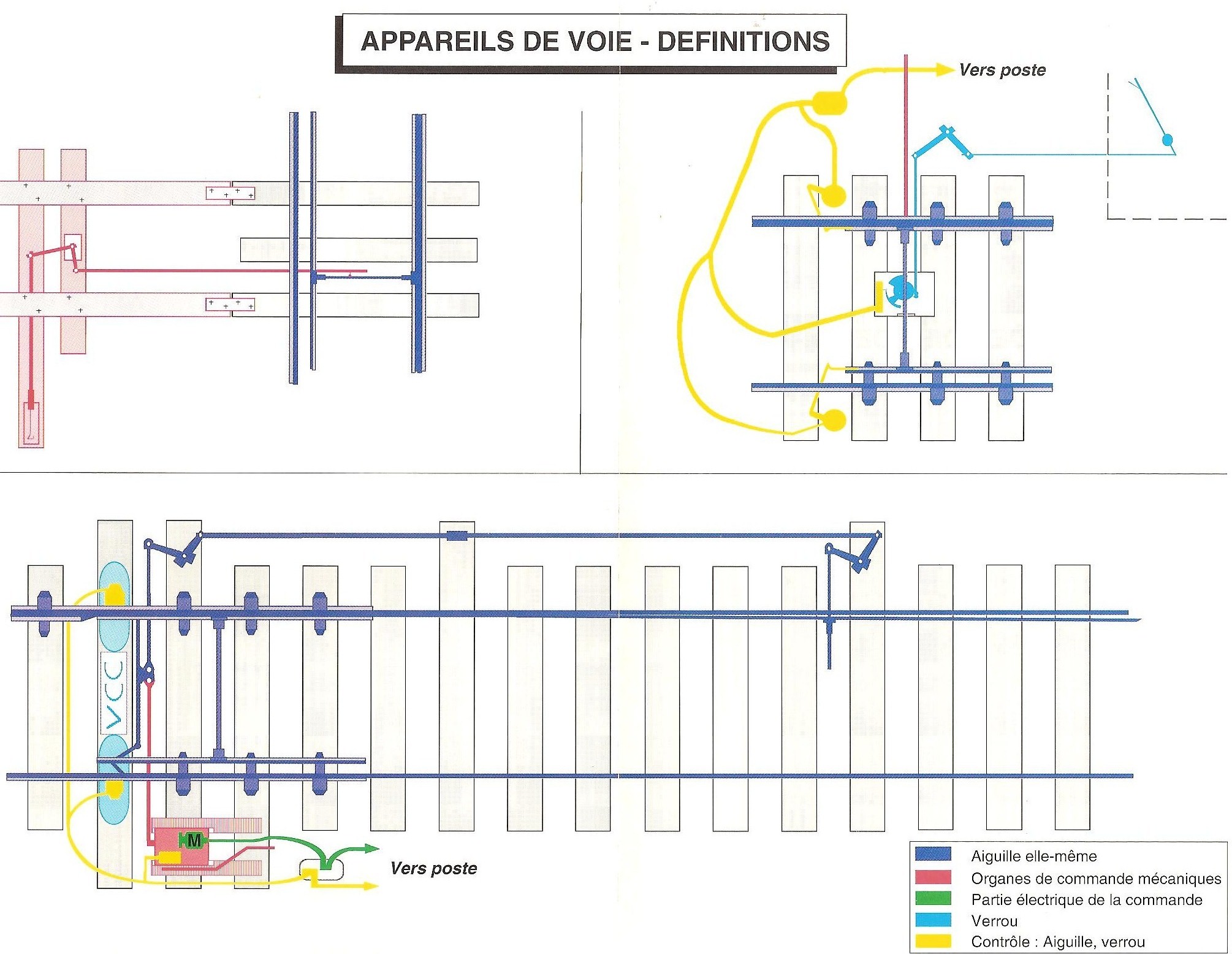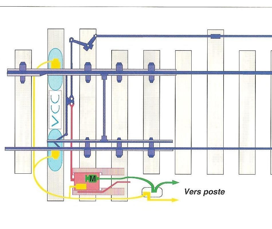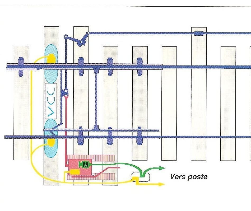 En bleue : aiguille elle-même En rouge : organes de commande mécaniques En vert : partie électrique de la commande (M = moteur) En bleu : verrou (VCC) En jaune : contrôle aiguille et verrou