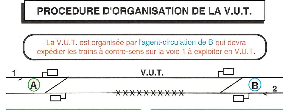 Principe général d'une V.U.T. La V.U.T. est organisée entre les deux changements de voies utilisables les plus proches qui constituent les extrémités de la V.U.T. Chaque extrémité de la V.U.T. est sous la responsabilité d'un agent-circulation qui assure le service de la circulation sur la V.U.T. en accord (demande et accord de voie) avec l'agent-circulation situé à l'autre extrémité de la V.U.T. La V.U.T. est toujours organisée par l'agent-circulation qui expédie les trains à contre-sens sur cette voie