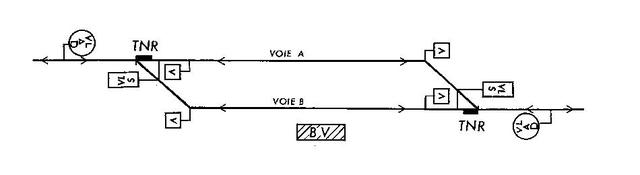 Signaux Les gares sont, de chaque côté, précédées d'un disque et d'un avertissement groupés et combinés Lorsque ces signaux sont lumineux, ils sont portés par un panneau à plaque D Elles comportent de plus au droit de chaque aiguille d'entrée, un T.I.V. de rappel 40 (ou 30) solidaire du verrou de l'aiguille, fermé lorsque l'aiguille est déverrouillée et annoncé alors par l'avertissement correspondant Elles comportent en général, pour chaque sens de circulation, un sémaphore de sortie commun à la voie directe et à la voie d'évitement Les manœuvres doivent y être effectuées sur sémaphore fermé Dispositions complémentaires Lorsque le sémaphore est lumineux, il est implanté au voisinage de l'aiguille de sortie et précédé sur chaque voie principale d'un chevron pointe en haut L'avertissement est manoeuvré solidairement avec le sémaphore correspondant