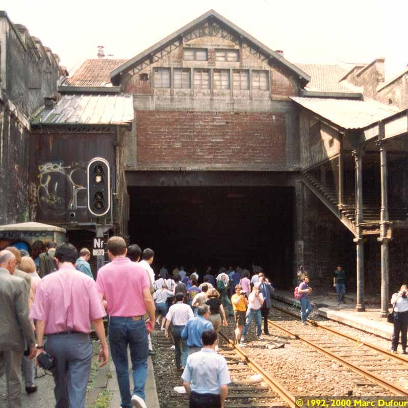 Justement, c'est immédiatement ce que j'ai pensé j'imaginais qu'on entrait sur la voie de St-Ouen avec un blanc mais j'ai un doute sur l'année de dépose de la voie. A la vue de cette photo, c'est simple, elle n'y est plus. Pour m'y être rendu, à cette époque et sur ce cliché, on visualise bien l'ancienne bif, à gauche PC/raccord PSL et à droite St-Ouen, (disons que le milieu sont le petit groupe de gens au centre, derrière eux on aperçoit le soutènement en béton qui sépare les deux accès), le bonhomme seul, chemise blanche, à gauche était sur les anciennes voies en heurtoir. Le mystère reste entier.
