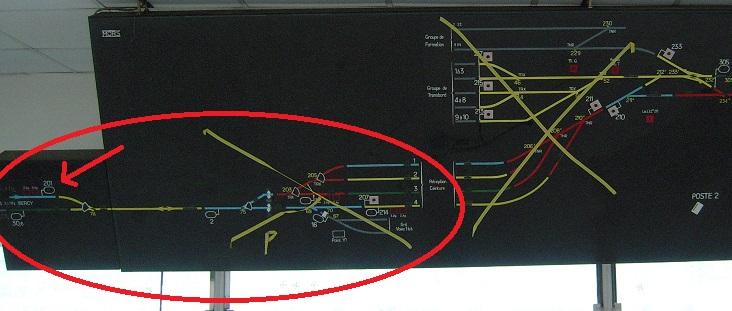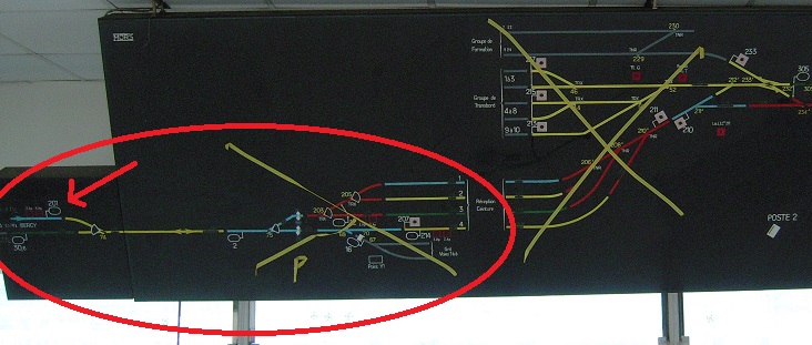 Sur le TCO du Poste 2 à PSL. La flèche rouge indique le C201 à St-Ouen. D'un coté, quand je regarde mes photos, les trains ayant franchi ce signal rencontrera que du Carré Violet derrière. Selon ma "théorie", peut être que les circulations étaient fatalement arrêtés au carré 201 fermé, devait s'annoncer au Poste pour savoir la voie de réception puis l'ouverture présentait un blanc, donc marche en manœuvre jusqu'au faisceau.