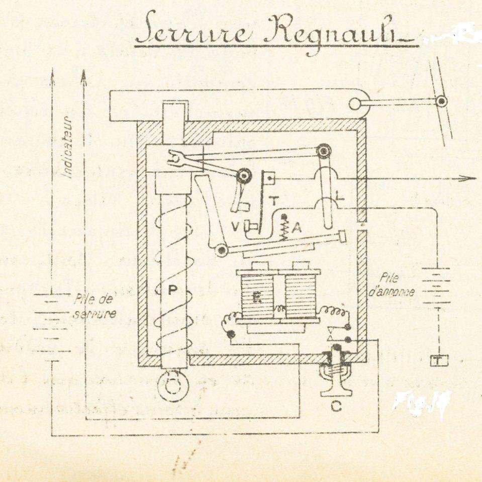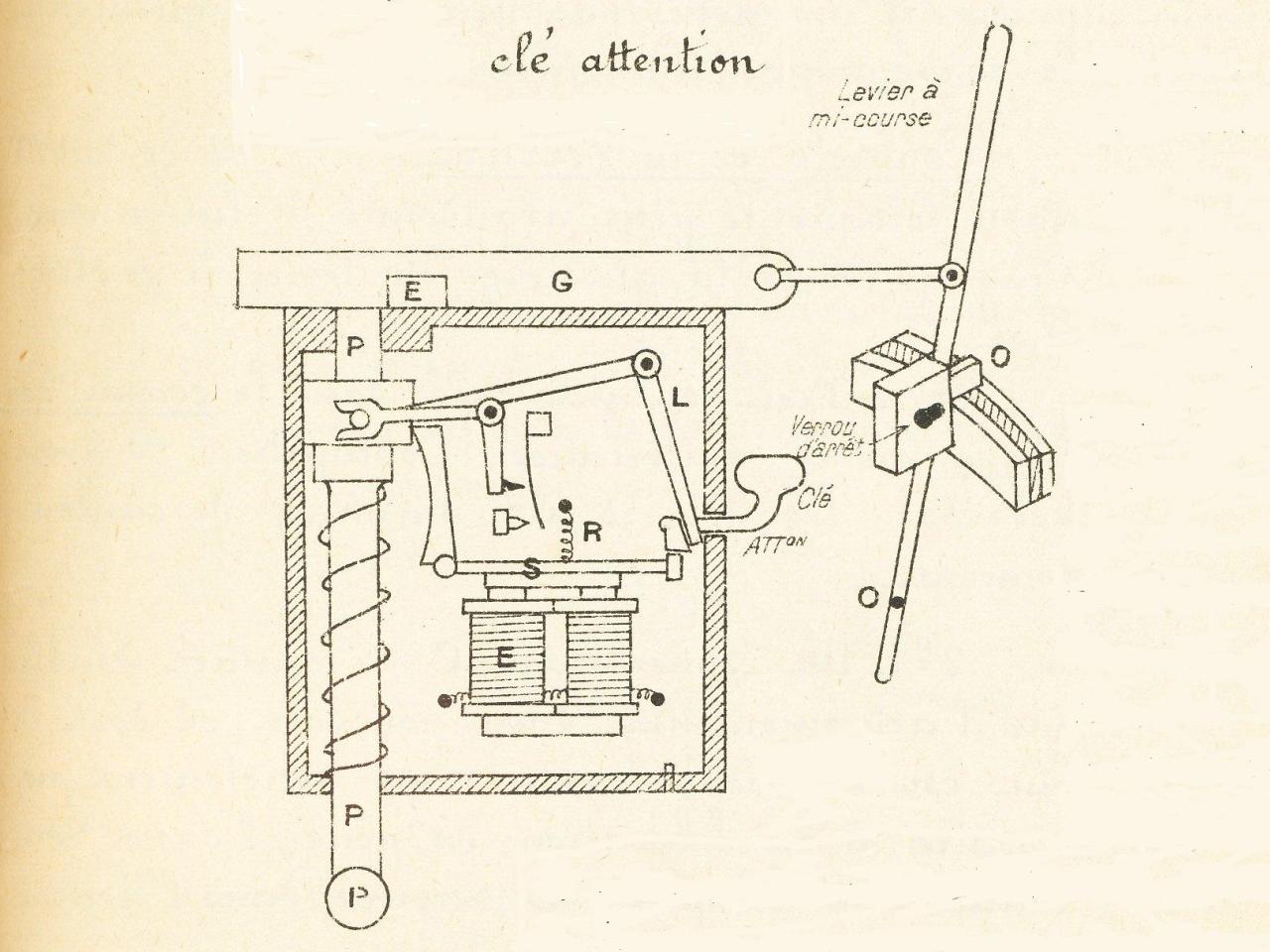 Cantonnement Regnault 3 2. Organes constitutifs du cantonnement (suite) : la serrure d'enclenchement Regnault (source des schémas : Chemins de Fer de l'Etat, cours de Monsieur Canivet, 1932) La serrure d'enclenchement Regnault comporte (voir schéma 1) : - une poignée terminée par un pêne P qui vient se loger dans l'encoche d'une tringle solidaire du levier spécial d'enclenchement quand ce dernier est refermé, et en empêche la réouverture - un électro-aimant E qui, lorsqu'il est excité, autorise le déplacement de la poignée et du pêne P, et donc la libération du levier spécial ; un poussoir C permet de limiter l'envoi de courant dans l'électro-aimant au temps strictement nécessaire à la libération du pêne. - un contact VT, établi lorsque le pêne est engagé dans l'encoche : inséré dans le circuit d'annonce, il matérialise l'obligation d'avoir redressé les leviers des signaux de cantonnement avant l'annonce au poste suivant. A côté de sa libération électrique par action de l'électro-aimant E, la libération mécanique du pêne de la serrure Regnault peut être obtenue par introduction dans cette serrure d'une clé spéciale dite "clé d'Attention" (voir schéma 2). Cette clé est normalement emprisonnée dans une serrure placée à proximité du secteur de manœuvre du levier spécial. Sa libération fait sortir le pêne de cette serrure, qui vient limiter à mi-course le mouvement du levier spécial, ne permettant donc l'ouverture du carré qu'avec présentation de la plaque "Attention". La clé d'Attention est prisonnière dans la serrure Regnault tant que le levier spécial n'a pas été ramené en position de fermeture. A suivre…j'espère