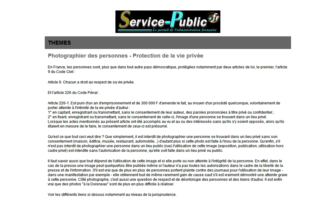 Il est nécessaire de bien distinguer 1--liberté de photographier sur la voie publique et 2-- droit à l'image ................................. voir pièce jointe ................................. Il ressort que sur la voie publique on peut photographier ce que l'on veut (l'usage du pied est soumis à autorisation ) mais que c'est la publication , la diffusion , la divulgation de la photo qui est réglementée. Un curieux cas particulier : la cours de cassation a autorisé la publication d'un reportage sur un hold-up où il y avait des policiers -évènement d'actualité -mais a rejeté la publication de la reconstitution - affaire privée ) Les tribunaux acceptent en général la publication des évènements d'actualité même s'il y figurent des personnes