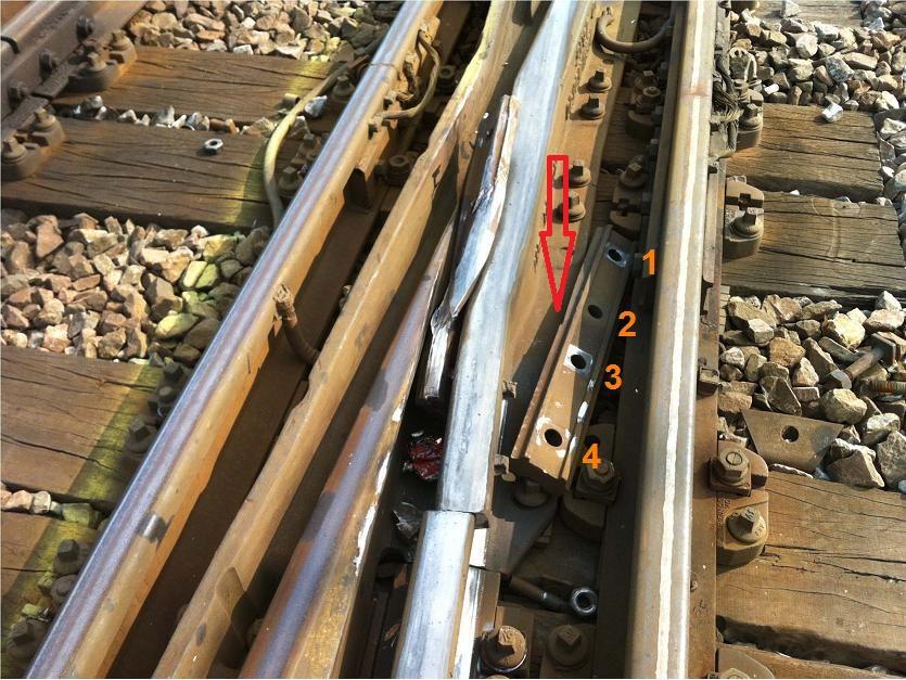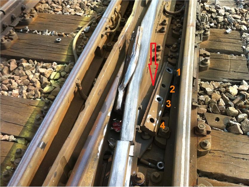Apres lecture et relecture des explications d'DU 94 LGV ,il semble que tu ais faux sur la rotation de l'eclisse extérieure. Grace à ta photo n1: On sait que le train arrive par la gauche de la photo,et on voit la rupture indétectable de la partie du rail et la contrainte d'écrasement supérieure sur le second rail,ce qui avec la fatigue du métal,va provoquer la rupture totale des écrous. En regardant ta photo n3: On voit qu'il y a un écrasement plus important au-dessus de l'ecrou 2(que j'indique avec la flèche rouge),ce qui correspond au coté du rail qui a subit le plus de contrainte.Je pense que l'éclisse ne s'est pas retournée. Ce n'est que mon avis.- Déraillement d'un train Intercités à Brétigny-sur-Orge