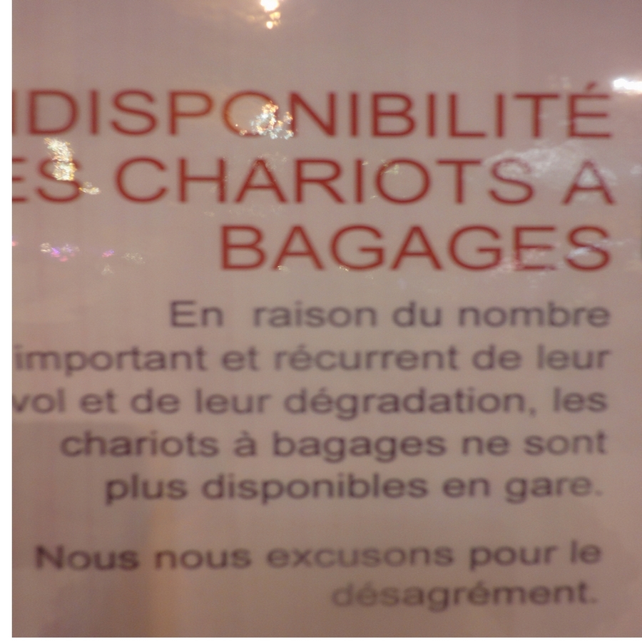 Avant de mettre en place de nouveaux services, il serait de bon ton d'assurer un minimum comme par exemple mettre à disposition des voyageurs des chariots à bagages, les vols et autres dégradations ont bon dos. Photo faite le 07 déc 2013 et pas dans une gare de pampa mais dans une grande gare parisienne