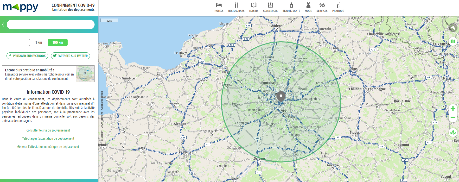 Ce n'est pas un site officiel, et en plus, c'est complètement mal foutu, cela reprend les communes qui sont accessibles dans le périmètre de 100 km par la route, et si tu vas à l'extrême de la commune en opposé de ton domicile, tu peux te retrouver largement au dessus des 100 km bien que la commune est dans le périmètre autorisé, je n'ai aucune confiance dans ce site.Tu aurais le droit d'aller en A et pas en bas sur la commune d'à coté alors que la distance serait sensiblement la même. Pour les départements verts et rouges, cela n'apas beaucoup d'importance, la seule différence notable concerne le ré ouverture des collèges ainsi que l'accès aux parc et jardins publics, voir le site officiel du gouvernement sur le coronavirus. https://www.gouvernement.fr/info-coronavirus/strategie-de-deconfinement Donc beaucoup de bruit avec cette colorisation des département pour pas grande chose en dehors du soucis des collégiens, enfin, cela occupe les français mais malheureusement, cela fait encore et toujours ressortir leurs mauvais cotés par rapport aux habitants des départements qui n'ont pas la bonne couleur. Bref, la très grande majorité des français n'ont rien compris et le pire se permettent de commenter en racontant des énormes conneries.