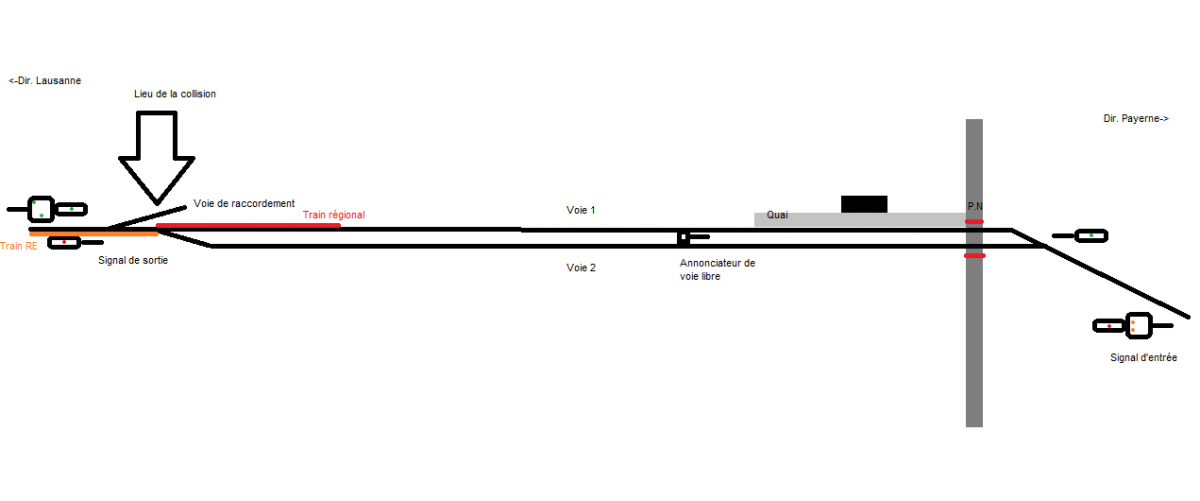 Alors non il n'y a ni DCO ni protection comme obstacle. De même aucun signal n'est franchissable. Pas le même système... Et le RE, soit le train sans arrêt, était bien attendu voie deux, laquelle est la voie déviée (60 ou 90km/h) pour la simple mais bonne raison qu'il n'y a pas de passage sous-voie et qu'un passage direct voie 1 alors qu'un train serait arrêté voie deux pour un arrêt commercial se ferait en entrée simultanée, soit marche-à-vue 20km/h le long du quai pour le train direct. Le quai voie 2, je ne suis pas sur qu'il existe encore d'ailleurs. Au passage, en Suisse la voie une est toujours côté BV. Elle ne dépend pas du sens de circulation "direction Paris" comme en France. Quand à la pseudo enquête sur FB, au moins l'article se veut-il digne et honorifique.