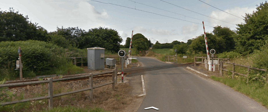 Si on regarde le street view: La barrière que l'on ne voit pas sur la photo existe bien, et il y a bien: -les deux demi-barrières -les quatres feux rouges -les deux sonneries, -le téléphone de type routier et celui de type SNCF -les pancartes qui informent du danger élecrique -les deux voyants d'annonce et je suppose les commutateurs en dessous -les pancartes indiquant les sens de circulation -ce que l'automobiliste doit faire en cas de problème, -le numéro du PN, -l'armoire à agrès Il manque peut-être la pancarte qui indique qu'il est interdit de pénétrer dans les emprises ferroviaires. Cette photo a a priori été mise pour montrer l'endroit où ont été prises les photos du 30/11 qui montrent un renforcement de tirefonds sur traverses béton sauf que sur le street view de juillet 2013 c'était encore des traverses en bois.