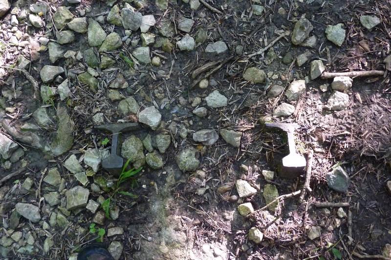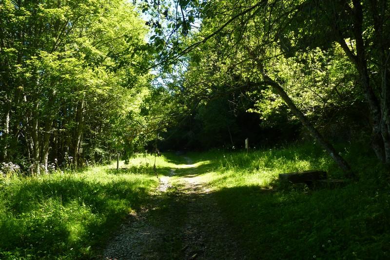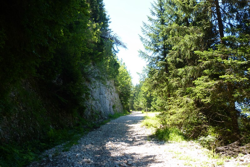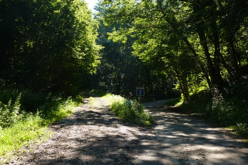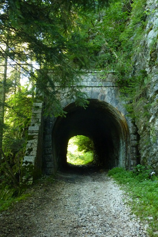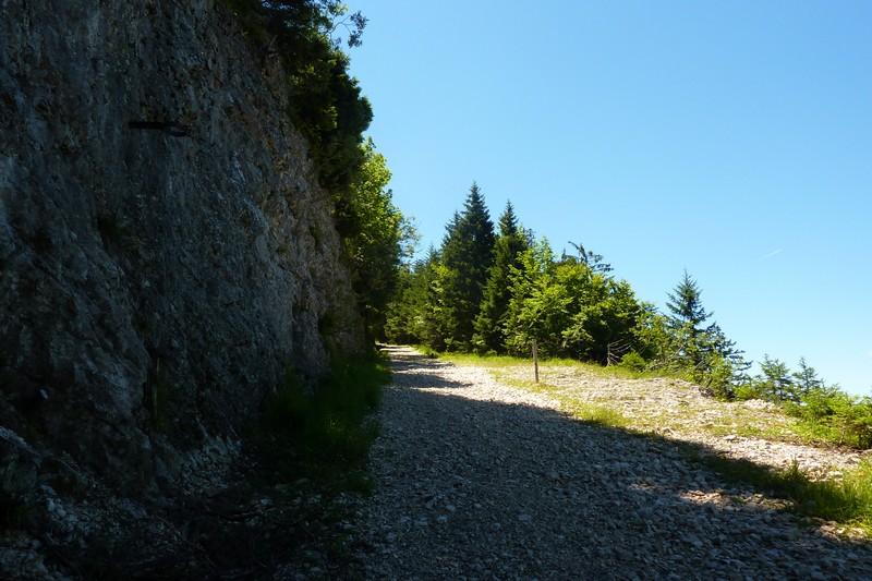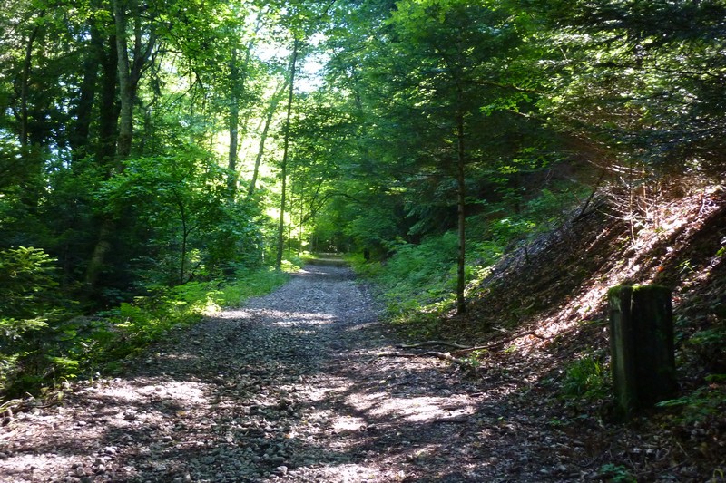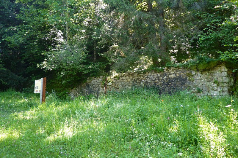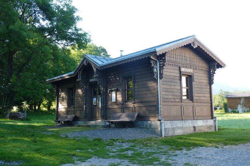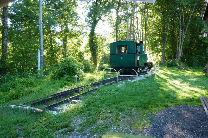 Entre la gare de Mouxy et la gare de Pré-Japert: Gare de Mouxy avec sa locomotive: Début de sentier sur lequel on peut voir des vestiges des rails: La voie, c'était tout droit dans le bois. Voie devenue route sur quelques centaines de mètres: Ensuite cela devient un chemin carrossable jusqu'au sommet: Vestiges que l'on voit jusqu'au sommet. Mais qu'est-ce que c'était?