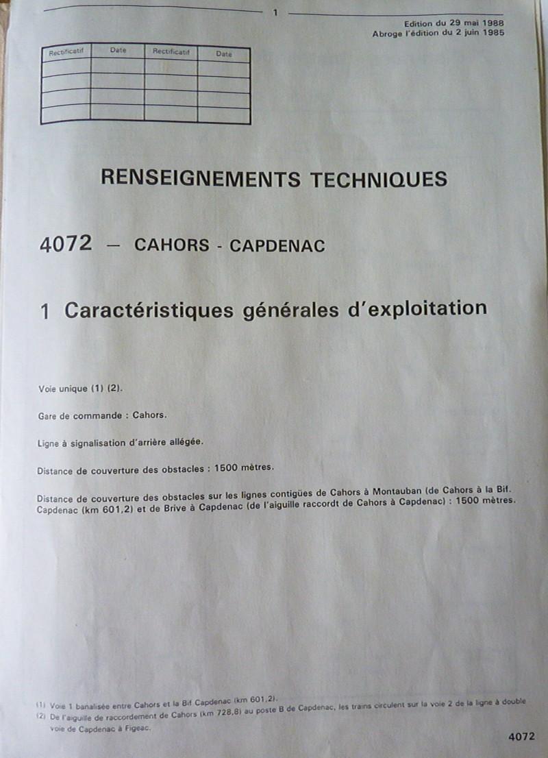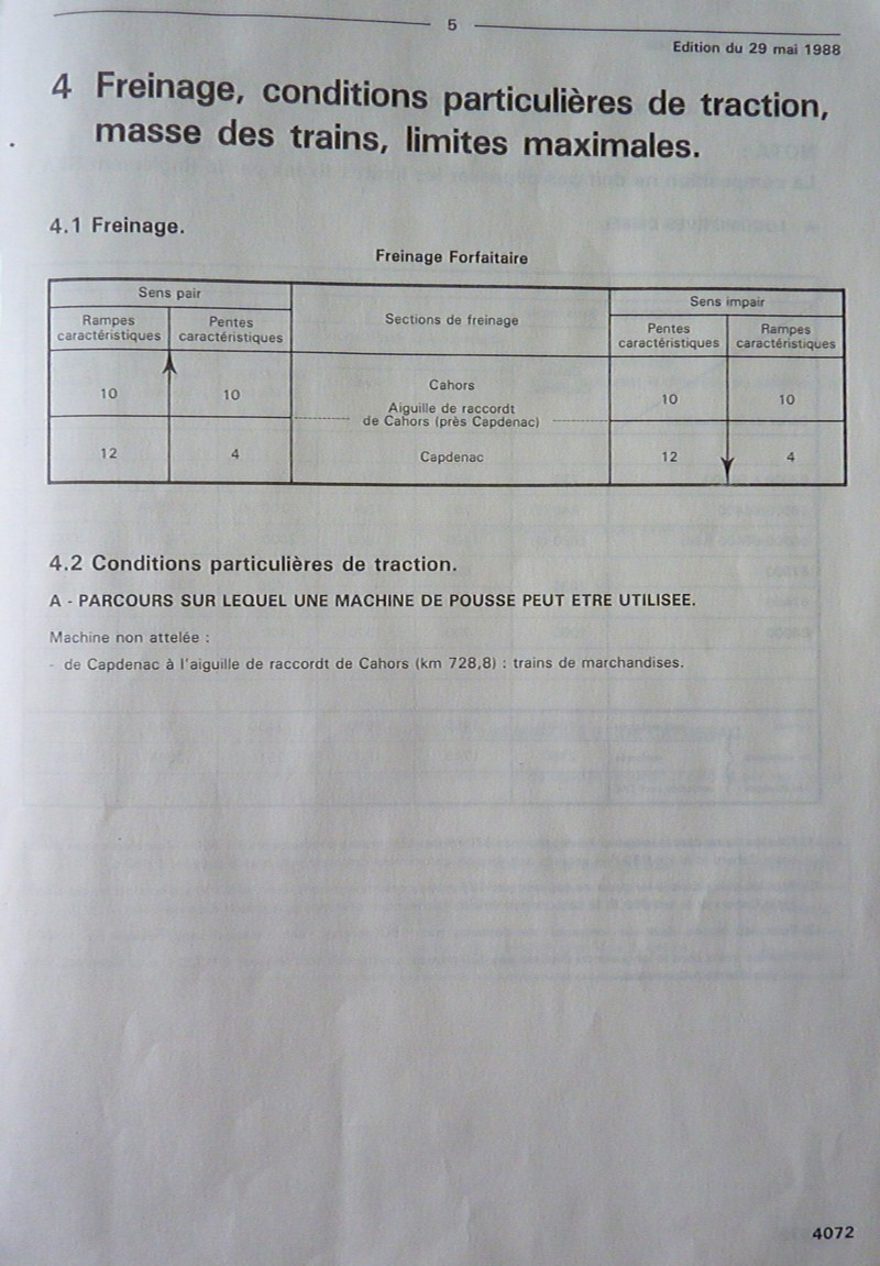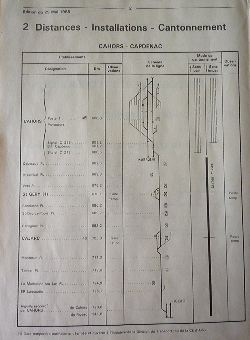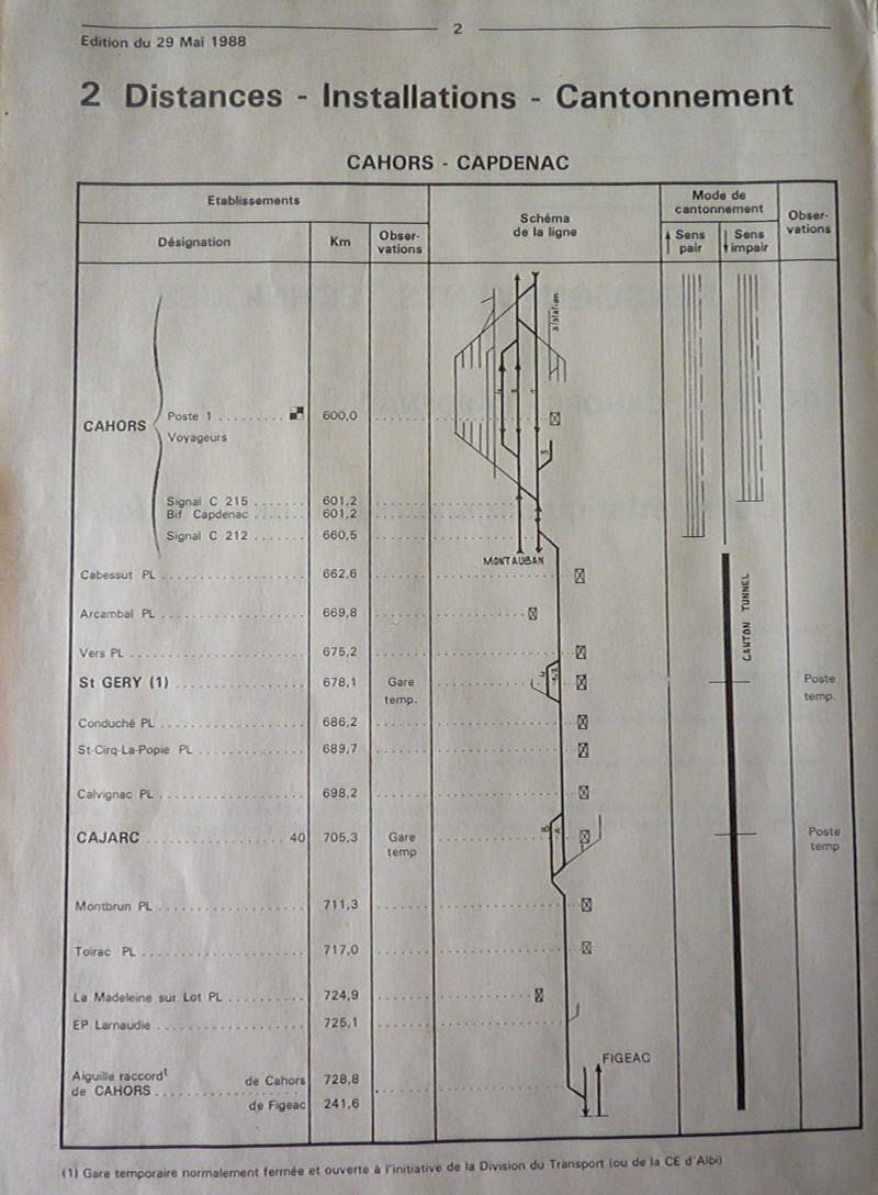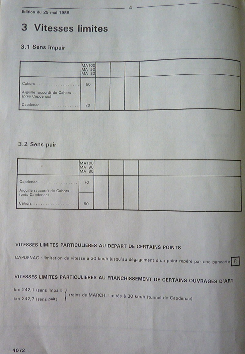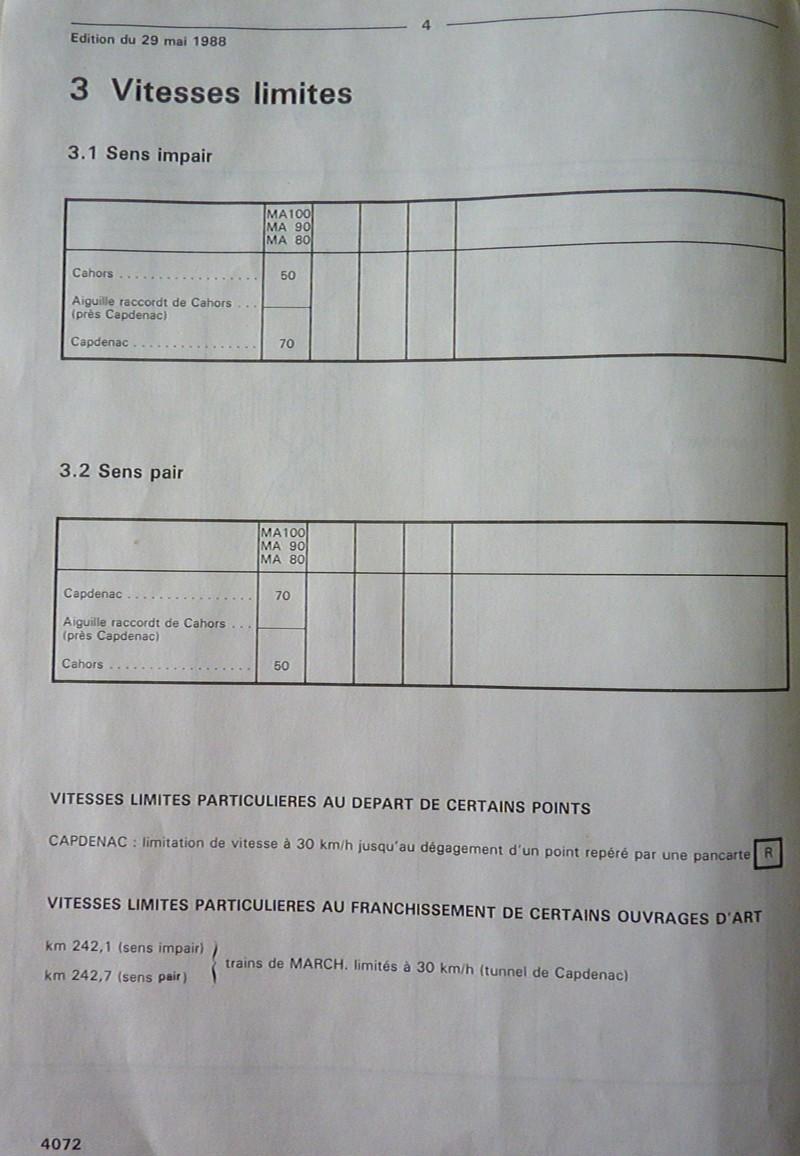 Voici pour ceux que cela peut interesser,les renseignements techniques de la ligne qui datent de 1988 et que j'avais photographiés dans un musée de la ligne. Receuil d'équivalence: En 1988 la vitesse était de 70 km/h sur toute la ligne. Sur les schémas de ligne qui datent de 1993 cette vitesse était descendue à 40 km/h. Les PN numéros 428, 432, 441, 444 et 445 se franchissaient à 20 km/h (TIV).