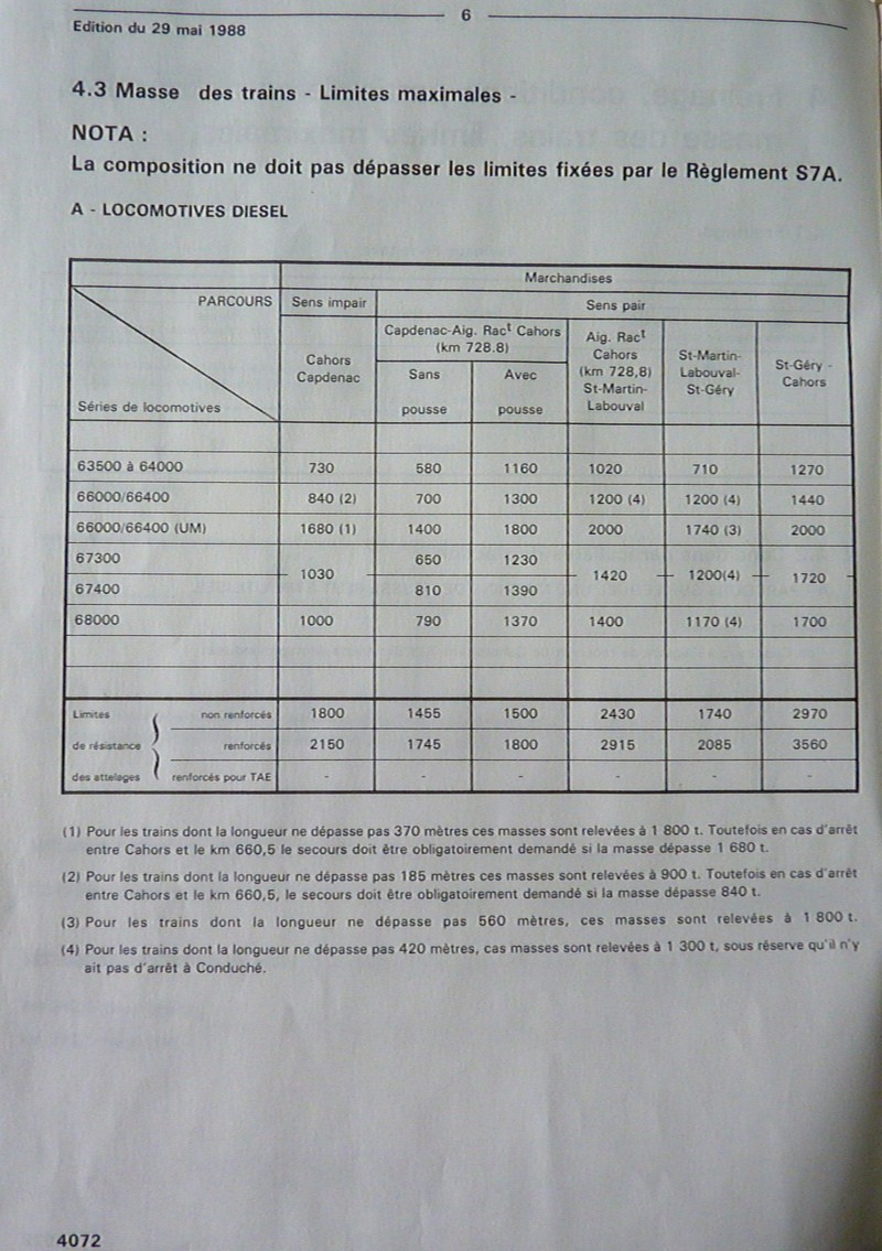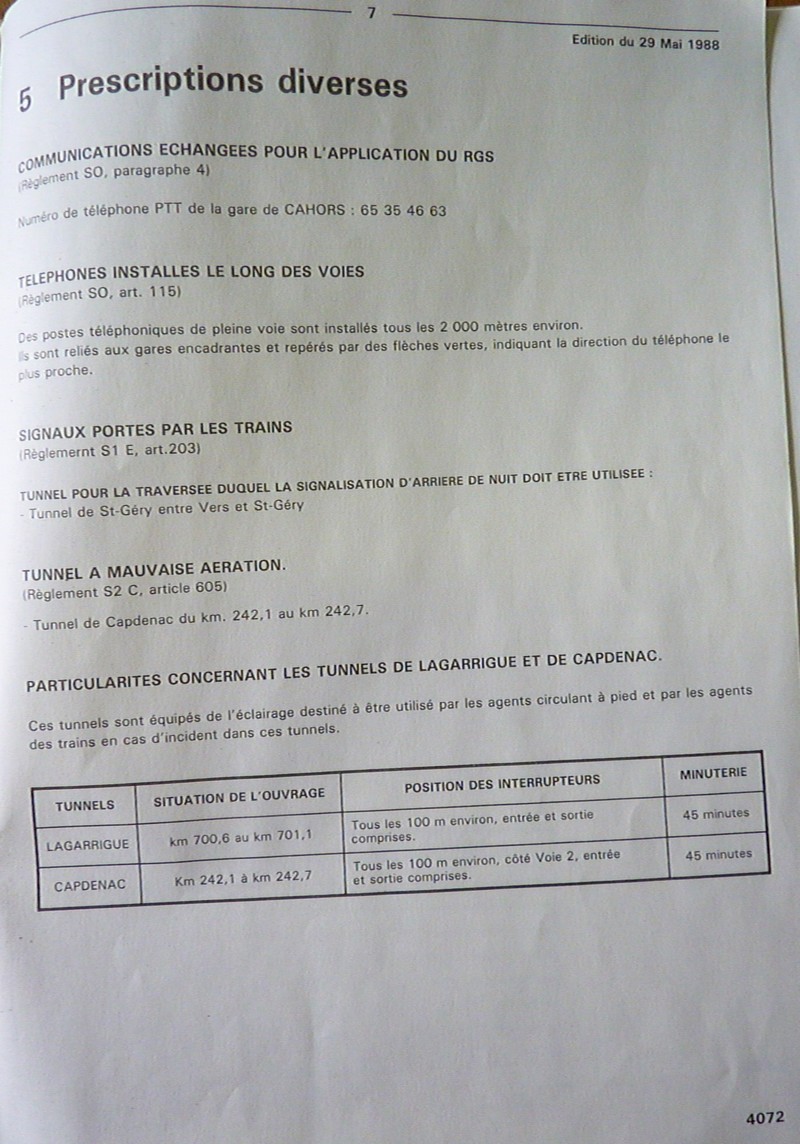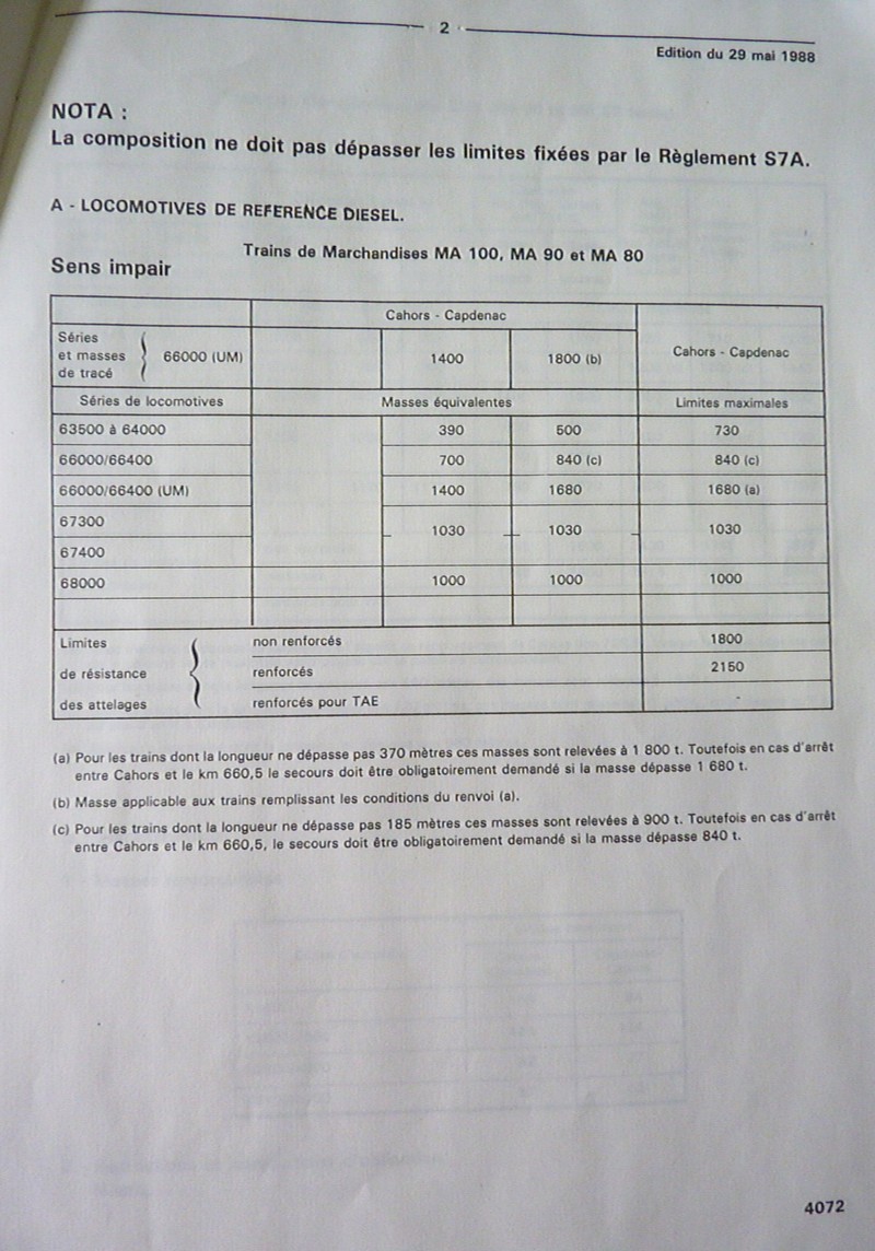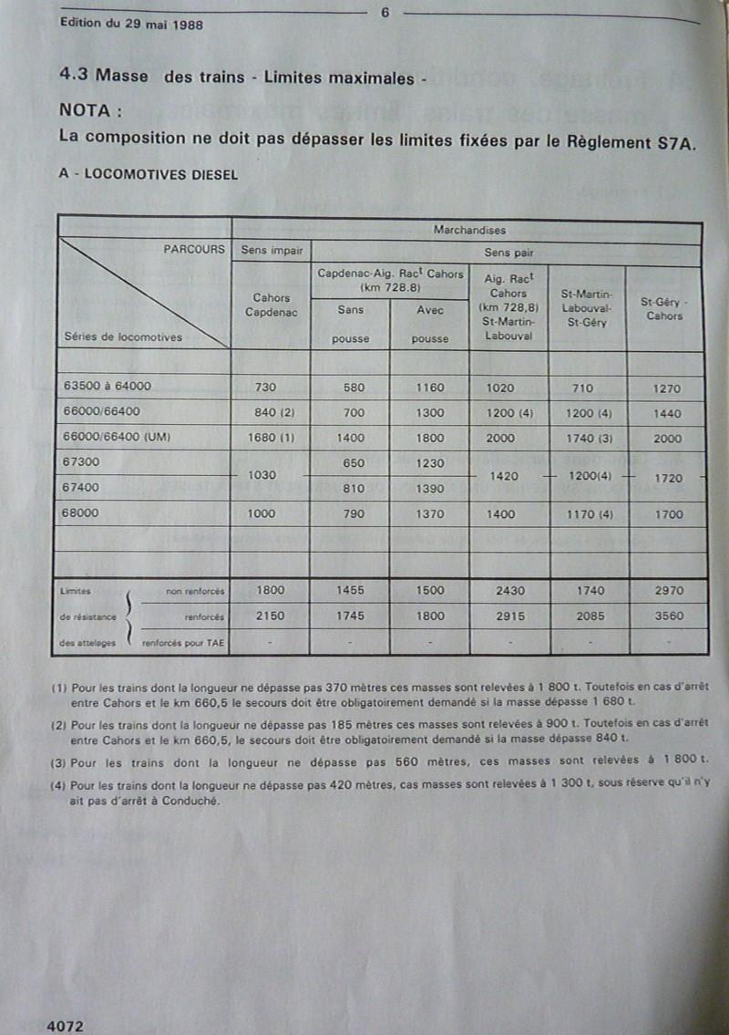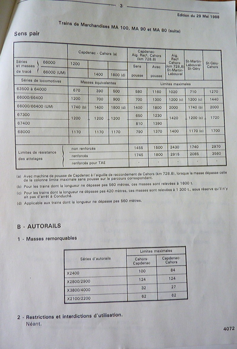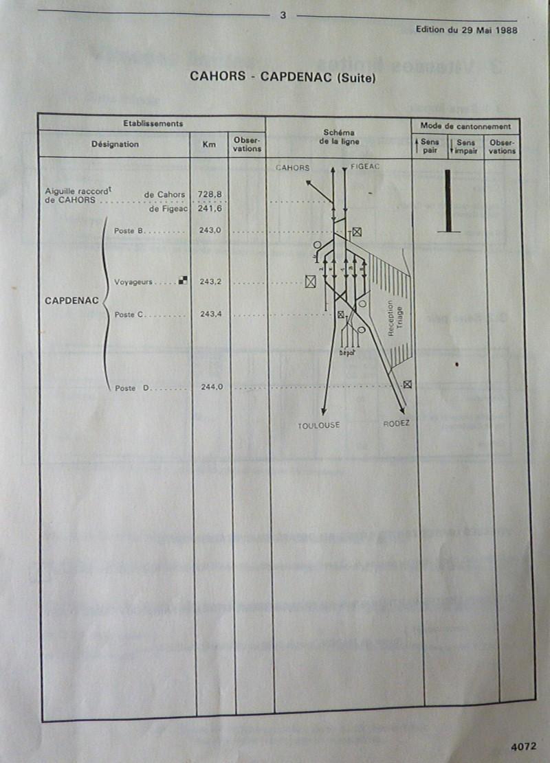 Voici pour ceux que cela peut interesser,les renseignements techniques de la ligne qui datent de 1988 et que j'avais photographiés dans un musée de la ligne. Receuil d'équivalence: En 1988 la vitesse était de 70 km/h sur toute la ligne. Sur les schémas de ligne qui datent de 1993 cette vitesse était descendue à 40 km/h. Les PN numéros 428, 432, 441, 444 et 445 se franchissaient à 20 km/h (TIV).