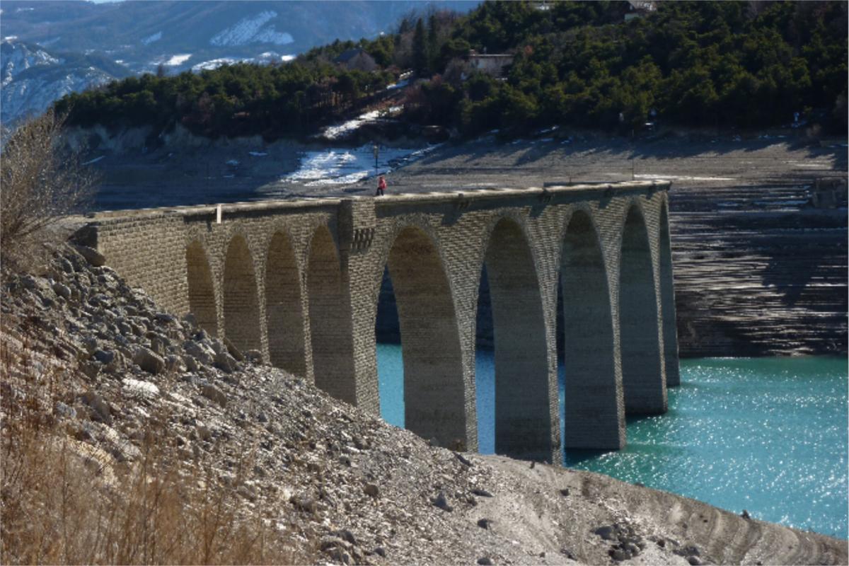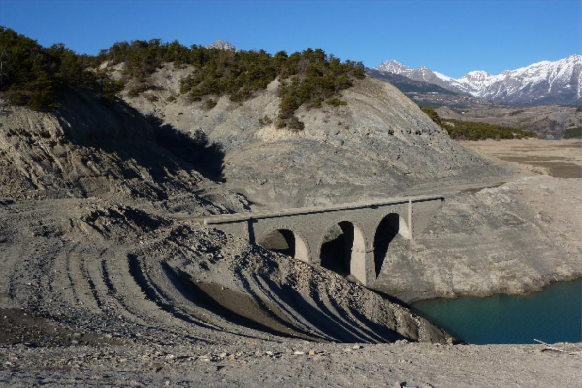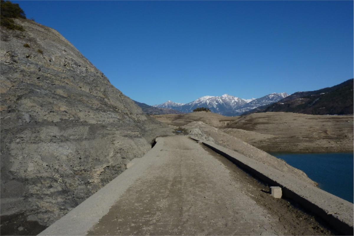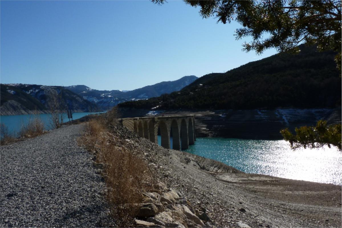 A Chanteloube: Bifurcation de la ligne inachevée vers Barcelonnette avec le viaduc submergé: Le lac vu depuis le viaduc:- Vestiges de l'ancienne ligne Gap-Briançon