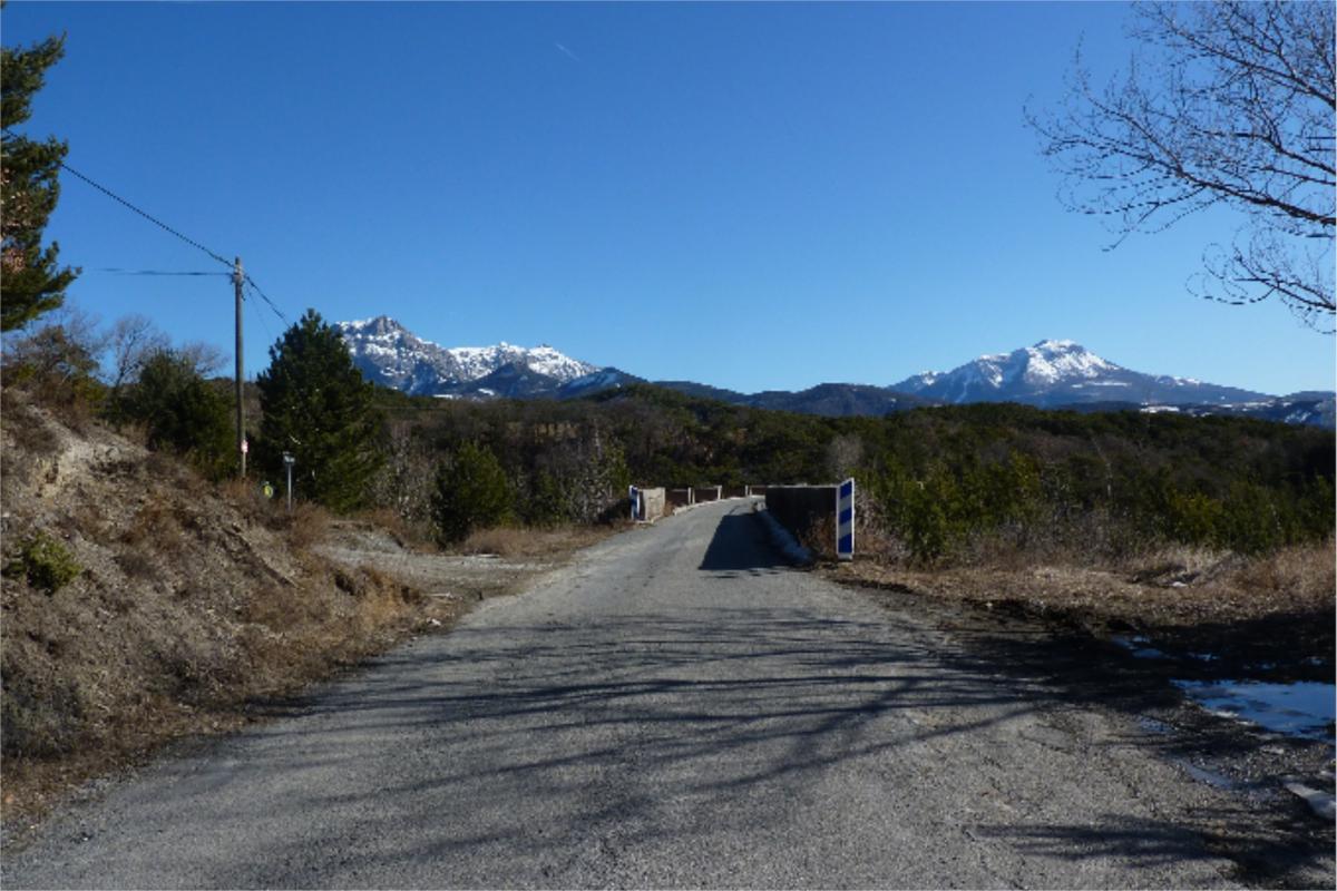 Vers Barcelonnette: Vers la bifurcation: Emplacement de l'entrée du tunnel Grand Pré n°1 derrière le tas de pierre: le pont a disparu. Petit pont à la sortie du tunnel.- Vestiges de l'ancienne ligne Gap-Briançon