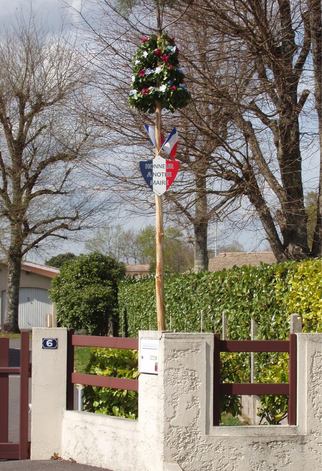 18. Bonjour, Connaîssez-vous cette tradition des villages du Sud-Ouest ? Ca existe dans d'autres régions ? Le mât (en pin des landes évidemment ) est planté dans le jardin de l'élu et pour les conseillers, "à notre maire" est remplacé par "à notre élu". Allez, adishatz !
