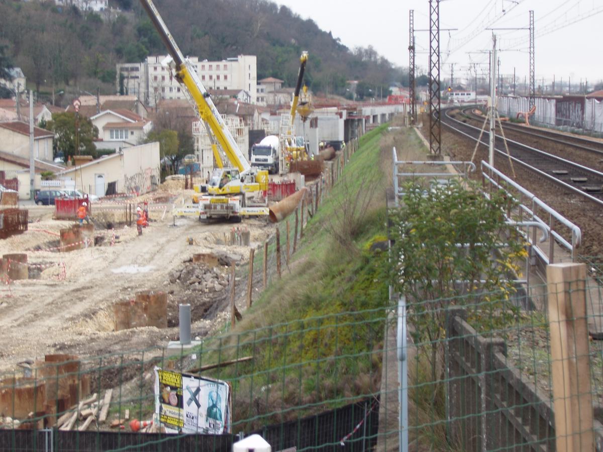 Bonjour à toutes et à tous, Le chantier de doublement des voies entre Bordeaux et la bifurcation de Cenon attaque le pont qui permettra d'agrandir la gare de Cenon. Vue des travaux effectués depuis l'ex-gare de la Benauge. D'autre part, voici la première pile (rive gauche) du pont qui enjambera la Dordogne.