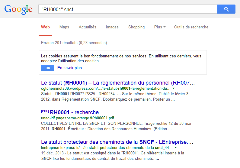 19. Une petite recherche Google nous apprend que : - L'intitulé "RH00001" a déjà été cité dans des journaux comme L'Express (le genre de magazine qu'on doit apprendre par coeur quand on est tenancier de baraque à frites). - En faisant une recherche sur ce mot clé, on trouve ce document "interne SNCF" en seconde position. Donc ça ne paraît pas si aberrant que ça.