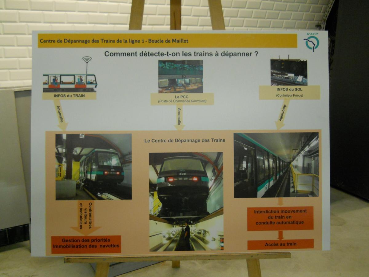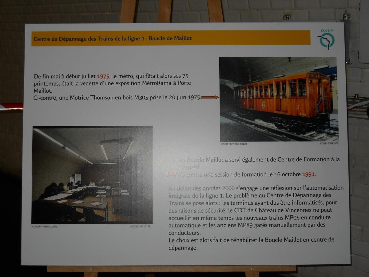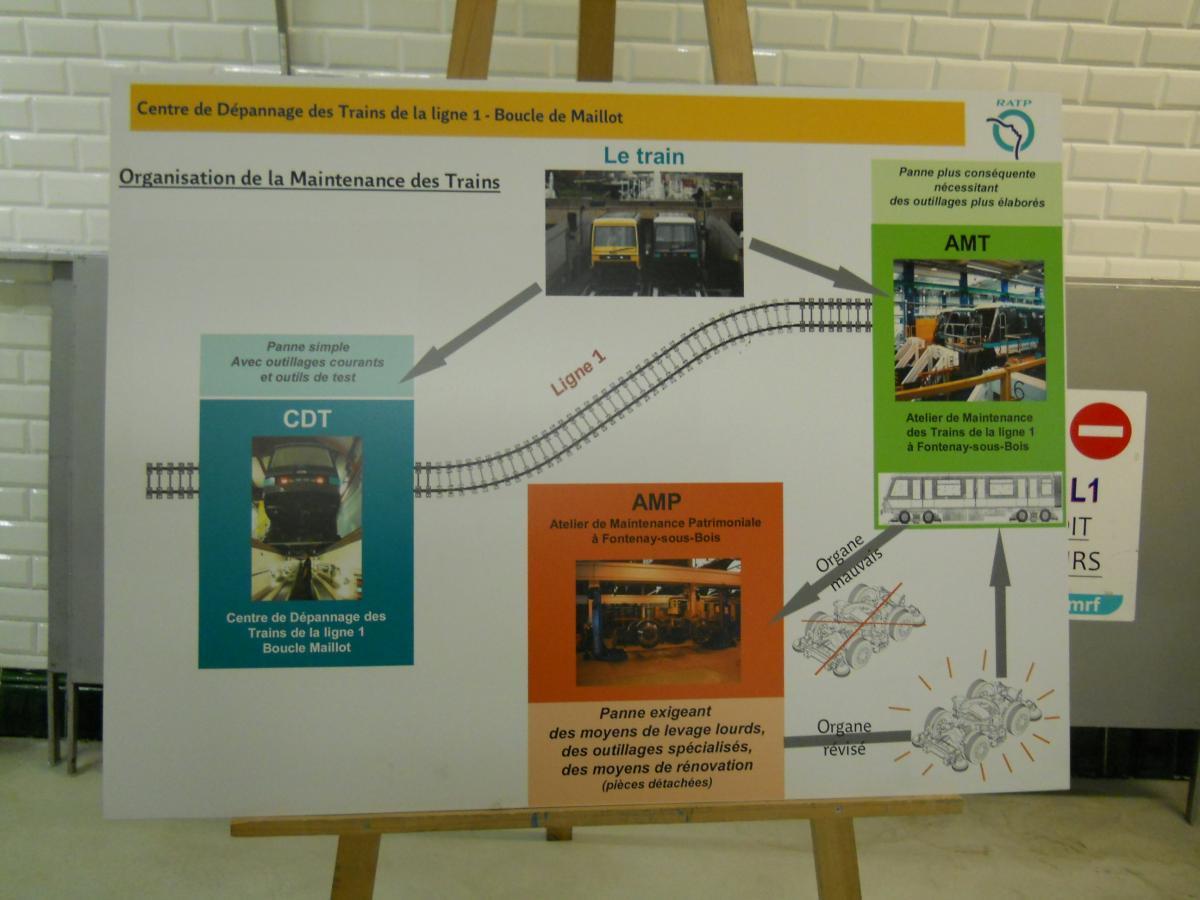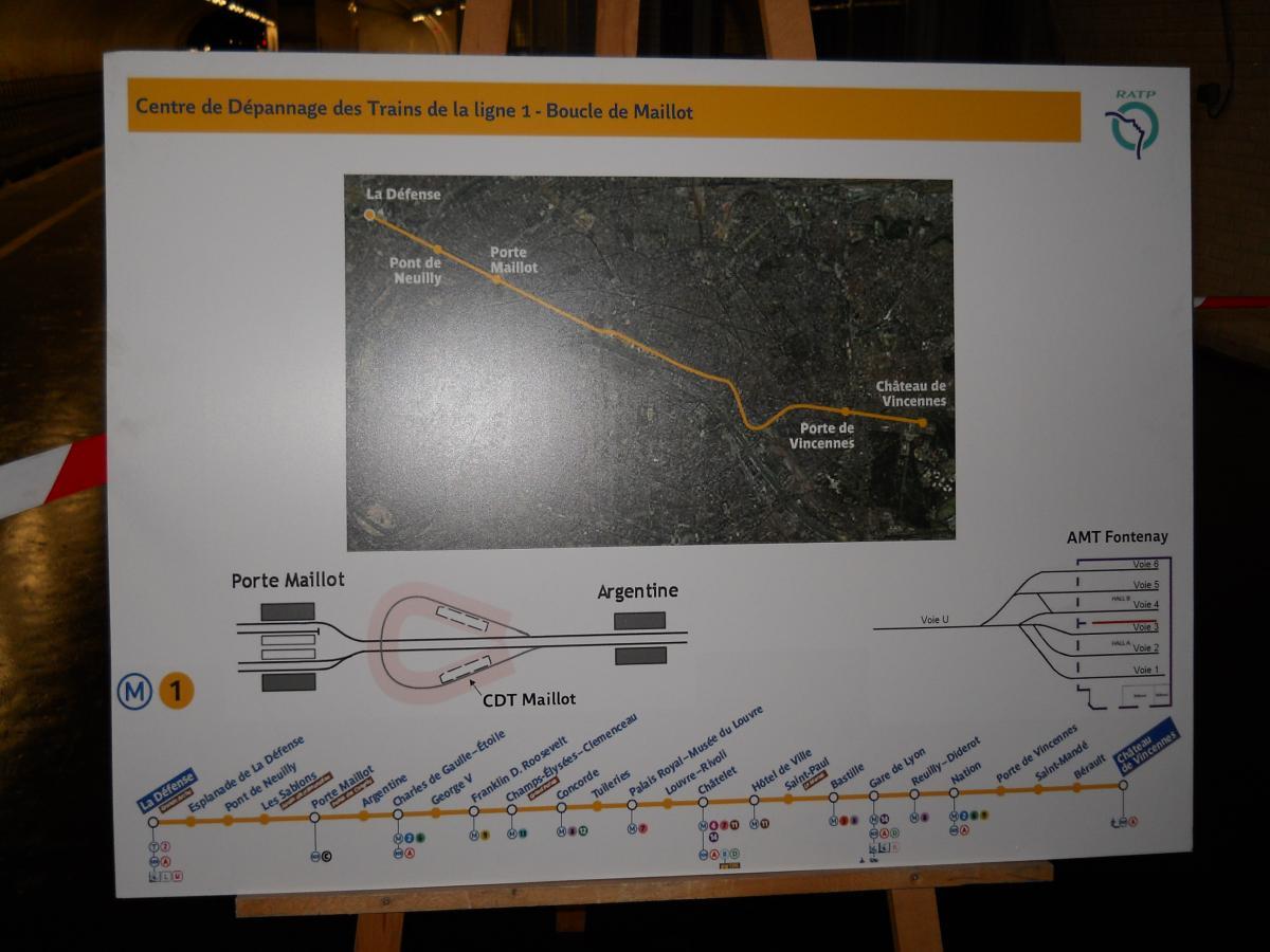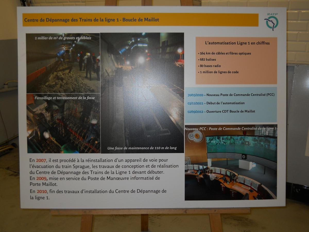 Le nouveau et étroit couloir d'accès au premier quai (non aménagé), qui remonte (au fond) vers les accès ouverts au public de l'actuelle station Porte Maillot. L'autre quai (illustré par les clichés suivants) bénéficie d'un accès construit de manière symétrique. Le plan de l'atelier, affiché à l'entrée du second couloir qui mène vers le second quai (ancien départ) de l'ancienne station. Le plan met bien en évidence les locaux de service (réfectoire, vestiaires, bureaux et entrepôts) qui ont été installés sur ce second quai, là où le premier quai n'a quasiment pas été aménagé. Panneaux explicatifs : construction et fonctionnement de l'atelier La surface du second quai a été fortement réduite du fait à la fois du rabotage du bord du quai, afin de faciliter l'accès aux organes de traction (ce rabotage est mis en évidence par l'important espace visible entre le bord du quai et la rame) et la construction de locaux techniques sur la quasi totalité de la longueur du quai (à l'exception de deux renfoncements, au fond à gauche et immédiatement à gauche). Au fond, on rejoint la voie en direction de Château de Vincennes. Vue du quai, cette fois en direction de la boucle en elle-même. Pour faciliter la maintenance, la voie ne comporte pas de rail de guidage : le train est guidé grâce aux roues de sécurité. Compte tenu de l'étroitesse des couloirs d'accès, le matériel ne peut être transféré (depuis et vers les ateliers de Fontenay) que par la ligne. Contrairement à ce qu'il en est pour les ateliers d'Auteuil, cet acheminement ne se fait pas par un convoi spécifique, mais directement dans l'une des rames MP 05. De préférence, la rame utilisée circule sans voyageurs directement depuis les ateliers de Fontenay jusqu'à l'atelier de la Porte Maillot. Mais pour éviter de surcharger la ligne, la rame utilisée pour le transfert peut prendre également des voyageurs, le matériel étant alors stocké dans une sorte de caisse cadenassée et l'emplacement utilisé dans la rame délimité par des barrières. Dans ce cas, la rame circule se rend de Fontenay à Porte de Vincennes, prend des voyageurs jusqu'au terminus de Neuilly, puis circule sans voyageurs uniquement depuis Neuilly jusqu'à l'atelier de la Porte Maillot (l'objectif étant dans tous les cas d'éviter les ruptures de charge pour les voyageurs). L'une des zones de dégagement sur l'ancien quai- Ligne 1 du métro de Paris : l'atelier de la Porte Maillot - Portes ouvertes lors des journées européennes du patrimoine - Samedi 14 septembre 2013