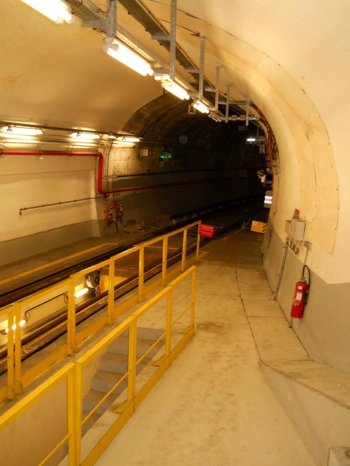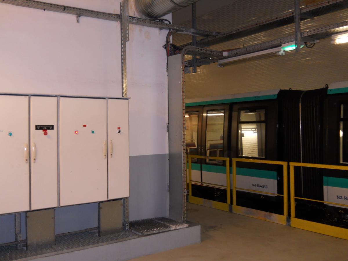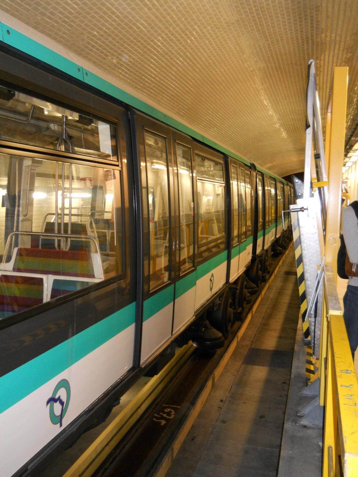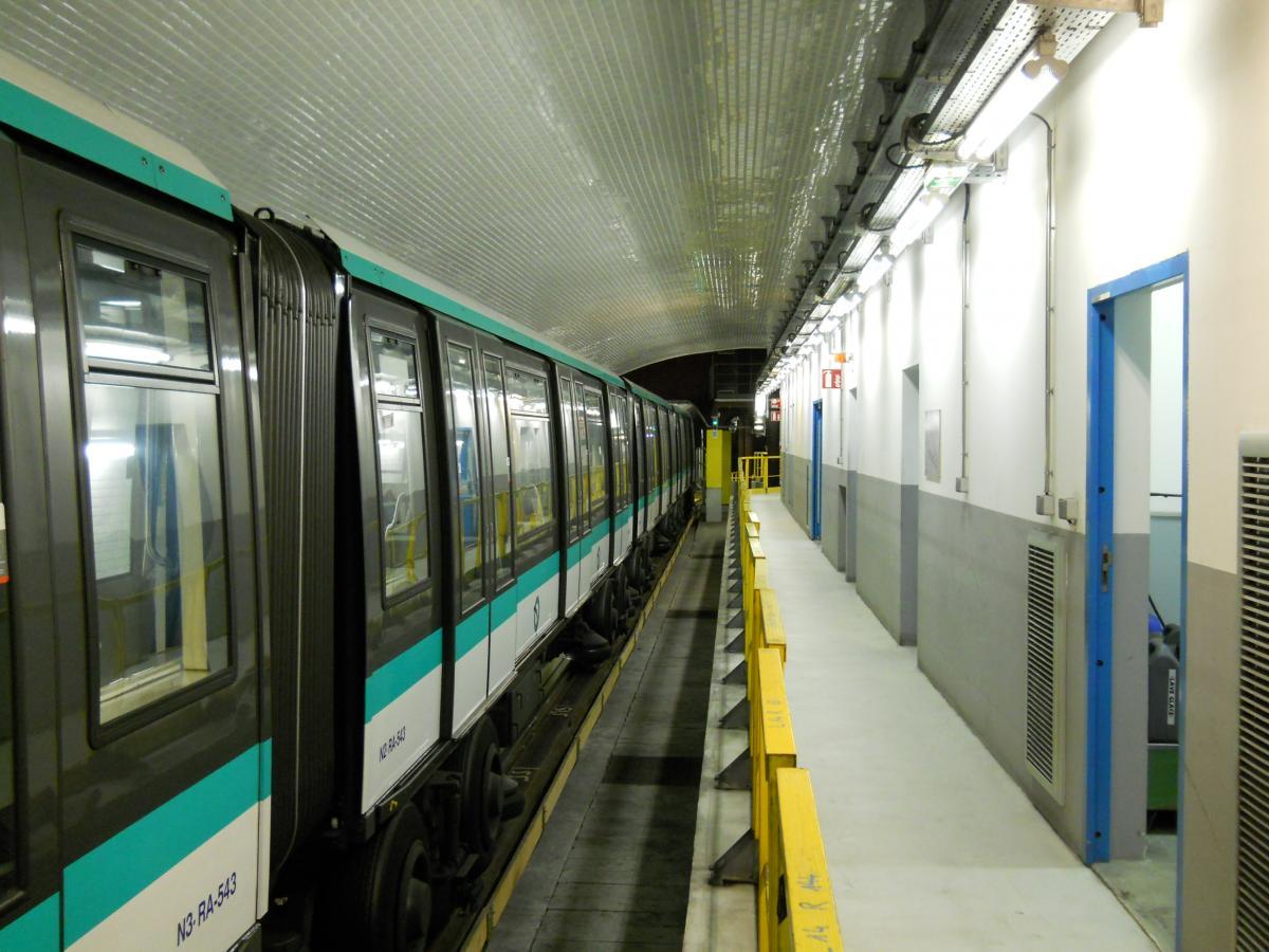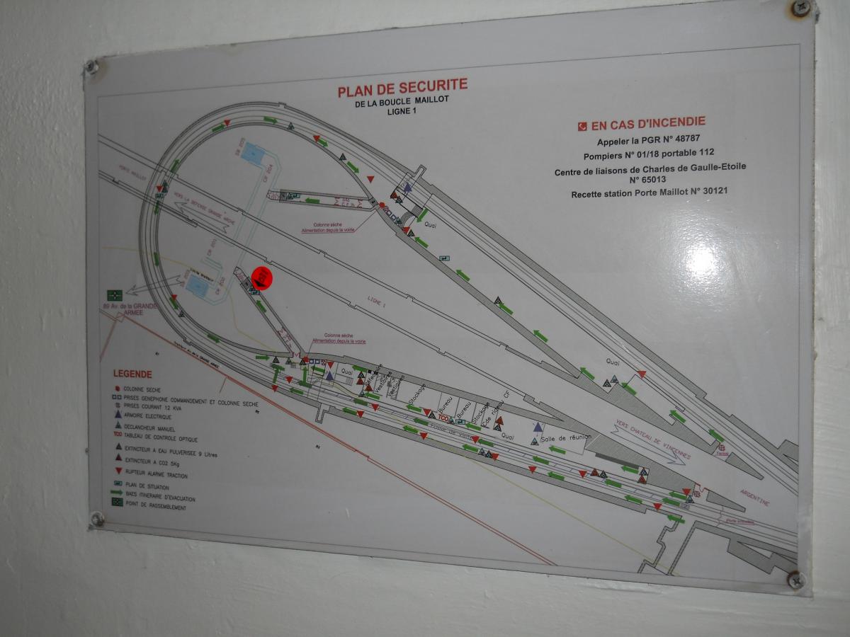 Le nouveau et étroit couloir d'accès au premier quai (non aménagé), qui remonte (au fond) vers les accès ouverts au public de l'actuelle station Porte Maillot. L'autre quai (illustré par les clichés suivants) bénéficie d'un accès construit de manière symétrique. Le plan de l'atelier, affiché à l'entrée du second couloir qui mène vers le second quai (ancien départ) de l'ancienne station. Le plan met bien en évidence les locaux de service (réfectoire, vestiaires, bureaux et entrepôts) qui ont été installés sur ce second quai, là où le premier quai n'a quasiment pas été aménagé. Panneaux explicatifs : construction et fonctionnement de l'atelier La surface du second quai a été fortement réduite du fait à la fois du rabotage du bord du quai, afin de faciliter l'accès aux organes de traction (ce rabotage est mis en évidence par l'important espace visible entre le bord du quai et la rame) et la construction de locaux techniques sur la quasi totalité de la longueur du quai (à l'exception de deux renfoncements, au fond à gauche et immédiatement à gauche). Au fond, on rejoint la voie en direction de Château de Vincennes. Vue du quai, cette fois en direction de la boucle en elle-même. Pour faciliter la maintenance, la voie ne comporte pas de rail de guidage : le train est guidé grâce aux roues de sécurité. Compte tenu de l'étroitesse des couloirs d'accès, le matériel ne peut être transféré (depuis et vers les ateliers de Fontenay) que par la ligne. Contrairement à ce qu'il en est pour les ateliers d'Auteuil, cet acheminement ne se fait pas par un convoi spécifique, mais directement dans l'une des rames MP 05. De préférence, la rame utilisée circule sans voyageurs directement depuis les ateliers de Fontenay jusqu'à l'atelier de la Porte Maillot. Mais pour éviter de surcharger la ligne, la rame utilisée pour le transfert peut prendre également des voyageurs, le matériel étant alors stocké dans une sorte de caisse cadenassée et l'emplacement utilisé dans la rame délimité par des barrières. Dans ce cas, la rame circule se rend de Fontenay à Porte de Vincennes, prend des voyageurs jusqu'au terminus de Neuilly, puis circule sans voyageurs uniquement depuis Neuilly jusqu'à l'atelier de la Porte Maillot (l'objectif étant dans tous les cas d'éviter les ruptures de charge pour les voyageurs). L'une des zones de dégagement sur l'ancien quai- Ligne 1 du métro de Paris : l'atelier de la Porte Maillot - Portes ouvertes lors des journées européennes du patrimoine - Samedi 14 septembre 2013