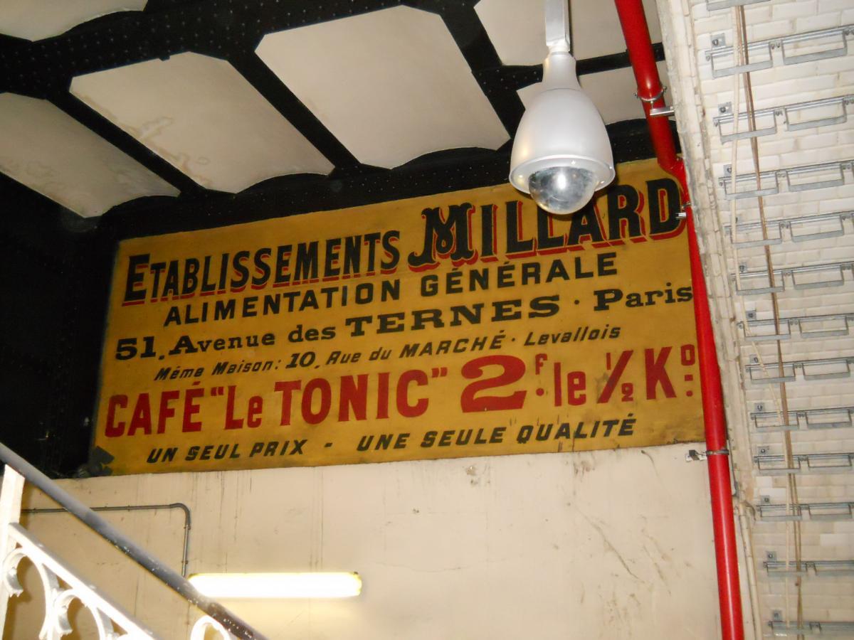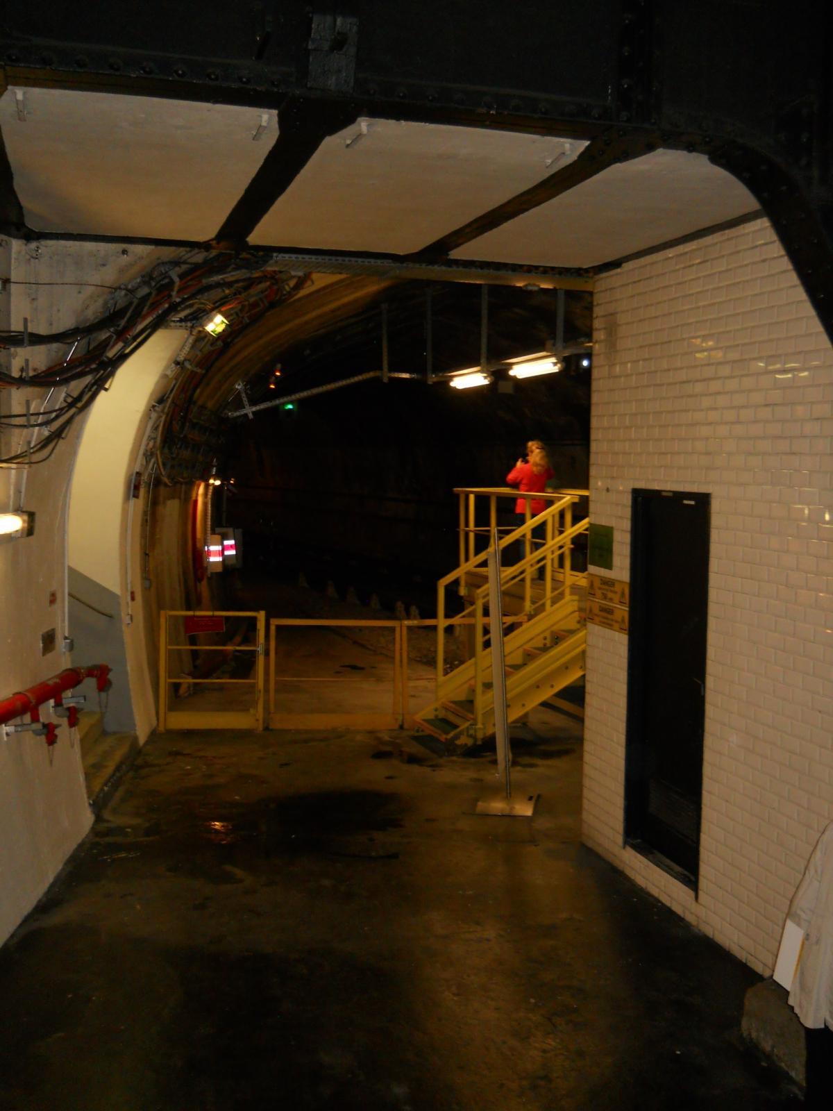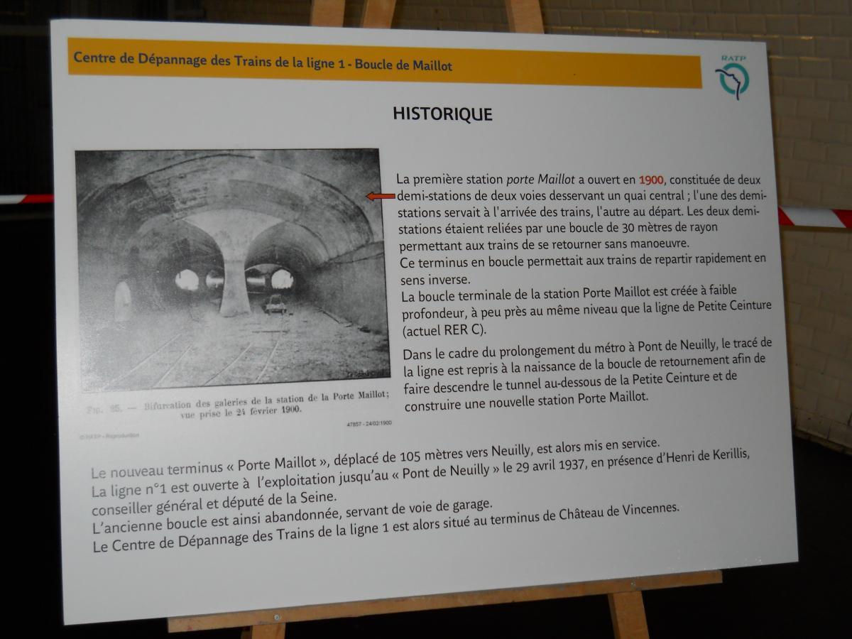 Au bout du premier quai (autrefois l'arrivée) de l'ancienne station, en direction de la boucle en elle-même Le premier quai vu en direction de la bifurcation (au fond) : les trains arrivent sur ce quai en empruntant la ligne depuis Château de Vincennes et en bifurquant avant d'arriver à la nouvelle station Porte Maillot. Ce quai ne comporte aucun équipement particulier et ne peut donc être utilisé que pour des réparations telles que le remplacement de tubes fluorescents à l'intérieur de la rame ou toute autre réparation ne nécessitant d'accès ni au toit, ni au dessous de la rame. Vue prise en direction de la boucle en elle-même. À droite et en haut de la photo, on distingue l'escalier et la passerelle de l'accès originel à l'ancienne station : cet escalier et cette passerelle sont toujours accessibles, mais leur accès n'était pas permis le jour de la visite et le guide n'a pas précisé si l'ancien accès se prolonge toujours jusqu'à la voirie extérieure. Désormais, l'accès à l'atelier s'effectue par le couloir de petites dimensions que l'on aperçoit à gauche, et qui rejoint les accès ouverts au public de la nouvelle station. Une publicité d'époque au-dessus de l'ancien escalier d'accès Le premier quai vu depuis le bas de l'ancien escalier d'accès, et à nouveau en direction de la bifurcation : l'accès au reste du quai n'était pas permis lors de la visite Panneaux explicatifs : plan et histoire de l'ancienne station En arrivant par le nouveau couloir d'accès, on passe à l'endroit illustré par les clichés 2225 et 2227, sous la passerelle de l'ancien accès pour remonter ensuite quelques marches avant d'atteindre le quai- Ligne 1 du métro de Paris : l'atelier de la Porte Maillot - Portes ouvertes lors des journées européennes du patrimoine - Samedi 14 septembre 2013