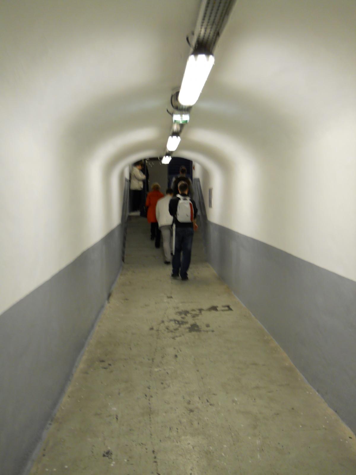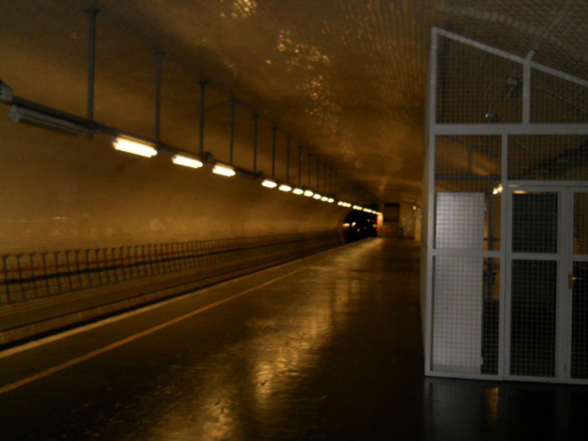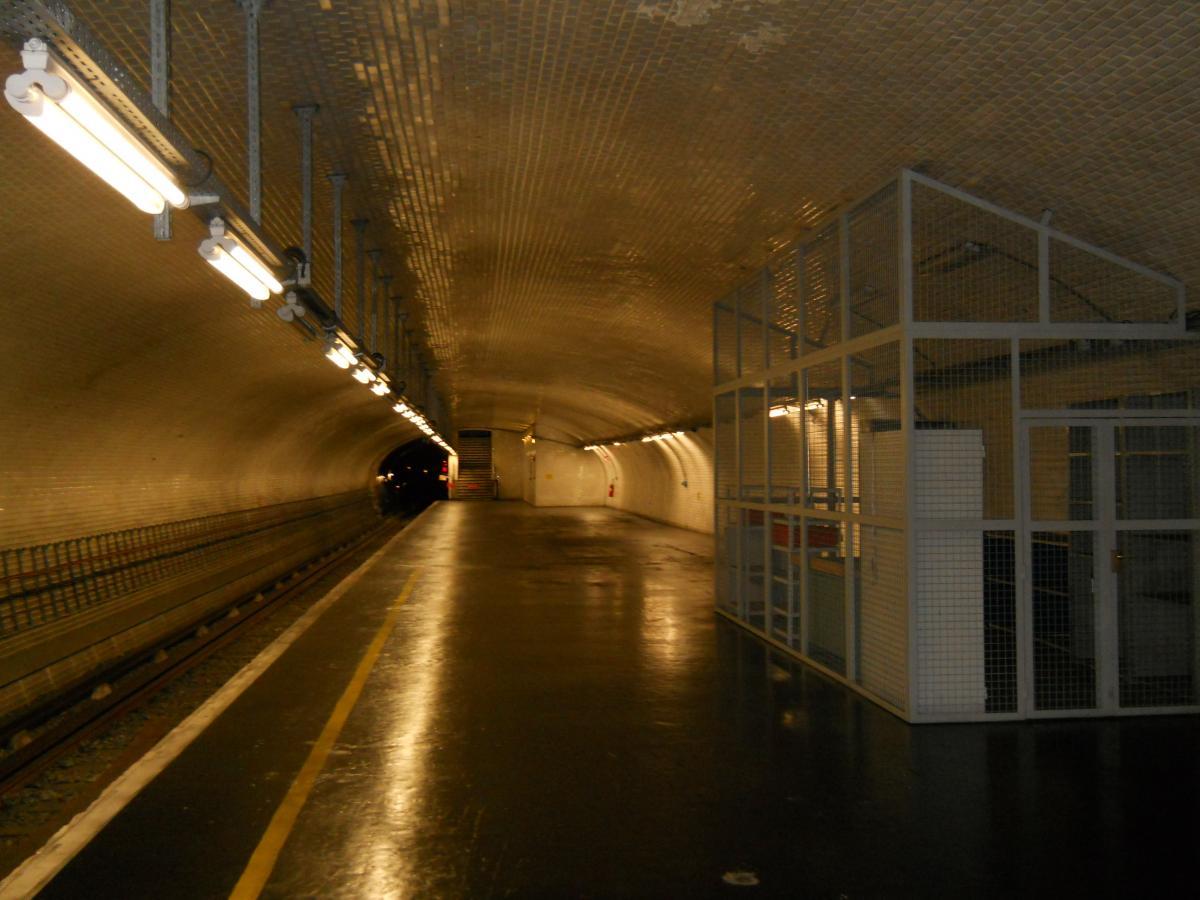Au bout du premier quai (autrefois l'arrivée) de l'ancienne station, en direction de la boucle en elle-même Le premier quai vu en direction de la bifurcation (au fond) : les trains arrivent sur ce quai en empruntant la ligne depuis Château de Vincennes et en bifurquant avant d'arriver à la nouvelle station Porte Maillot. Ce quai ne comporte aucun équipement particulier et ne peut donc être utilisé que pour des réparations telles que le remplacement de tubes fluorescents à l'intérieur de la rame ou toute autre réparation ne nécessitant d'accès ni au toit, ni au dessous de la rame. Vue prise en direction de la boucle en elle-même. À droite et en haut de la photo, on distingue l'escalier et la passerelle de l'accès originel à l'ancienne station : cet escalier et cette passerelle sont toujours accessibles, mais leur accès n'était pas permis le jour de la visite et le guide n'a pas précisé si l'ancien accès se prolonge toujours jusqu'à la voirie extérieure. Désormais, l'accès à l'atelier s'effectue par le couloir de petites dimensions que l'on aperçoit à gauche, et qui rejoint les accès ouverts au public de la nouvelle station. Une publicité d'époque au-dessus de l'ancien escalier d'accès Le premier quai vu depuis le bas de l'ancien escalier d'accès, et à nouveau en direction de la bifurcation : l'accès au reste du quai n'était pas permis lors de la visite Panneaux explicatifs : plan et histoire de l'ancienne station En arrivant par le nouveau couloir d'accès, on passe à l'endroit illustré par les clichés 2225 et 2227, sous la passerelle de l'ancien accès pour remonter ensuite quelques marches avant d'atteindre le quai- Ligne 1 du métro de Paris : l'atelier de la Porte Maillot - Portes ouvertes lors des journées européennes du patrimoine - Samedi 14 septembre 2013