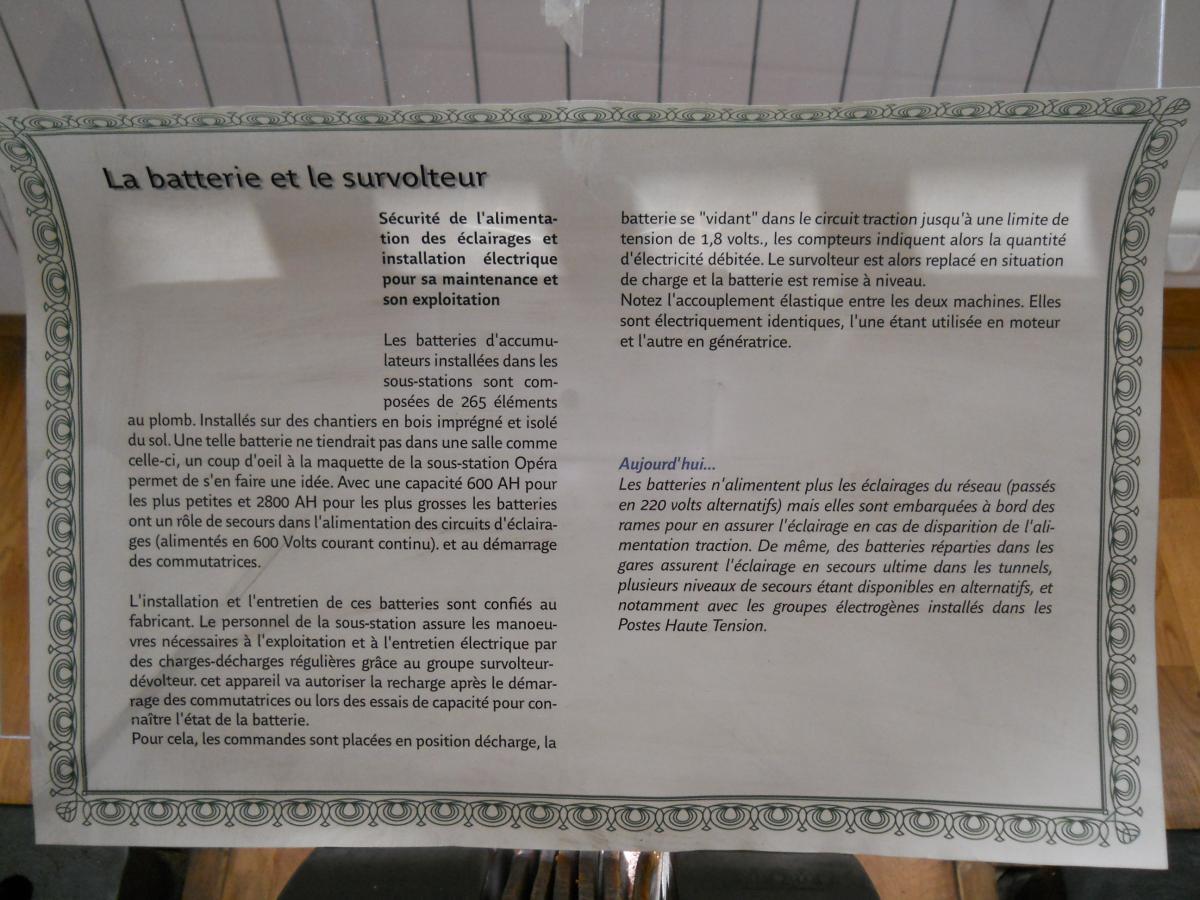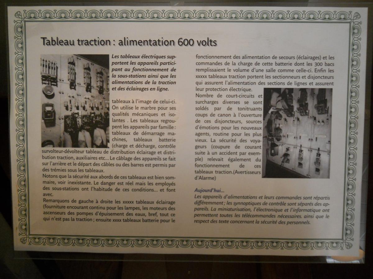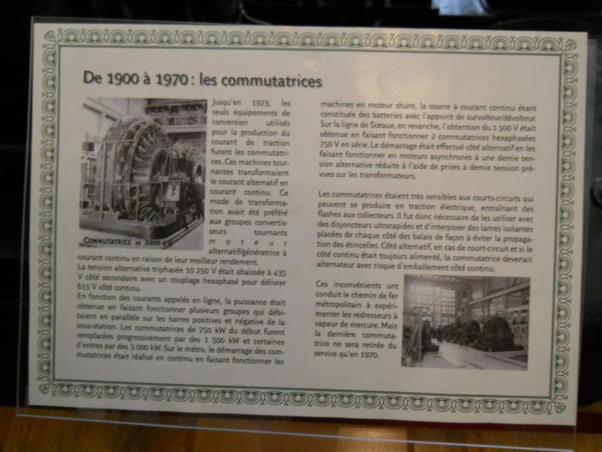 un sujet a été posté par Cyril83 dans INFRA : gestion des circulations, voie, bâtiment, ouvrages d'art, signalisation, caténaires, ...Cette année encore, la RATP proposait lors des journées du patrimoine des "parcours commentés" sur le thème du patrimoine du métro : l'architecture Guimard, les stations de la ligne 6, les oeuvres d'art offertes par des réseaux étrangers... Cette année, le parcours se terminait à l'ancienne sous-station de Bel-Air. Désaffecté, le grand hall qui abritait autrefois les appareillages est désormais vide, mais dans une salle attenante, des passionnés ont rassemblé quelques anciens appareillages dans un espace d'exposition qui n'est cependant pas pour l'instant ouvert au public en temps normal. Je poste ici les photos prises à cette occasion. La photo de la pancarte explicative suit généralement la photo de l'appareil auquel la pancarte se rapporte.- Ligne 1 du métro de Paris : l'atelier de la Porte Maillot - Portes ouvertes lors des journées européennes du patrimoine - Samedi 14 septembre 2013