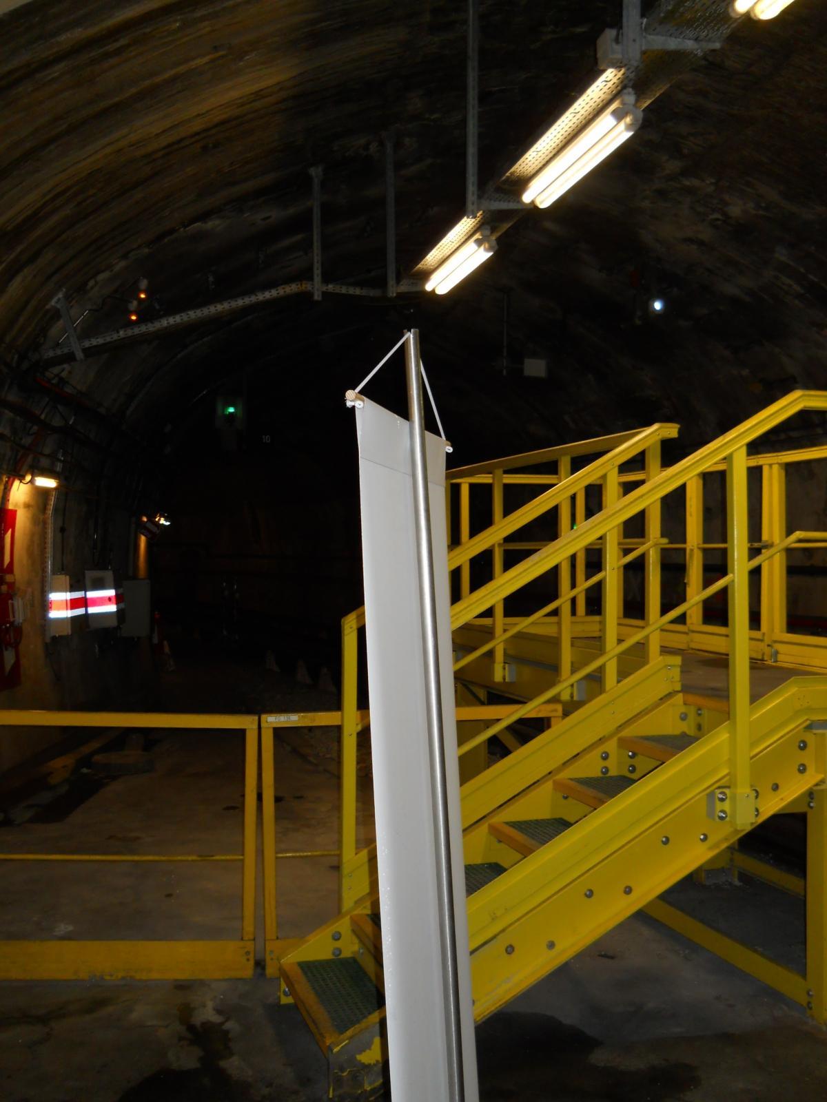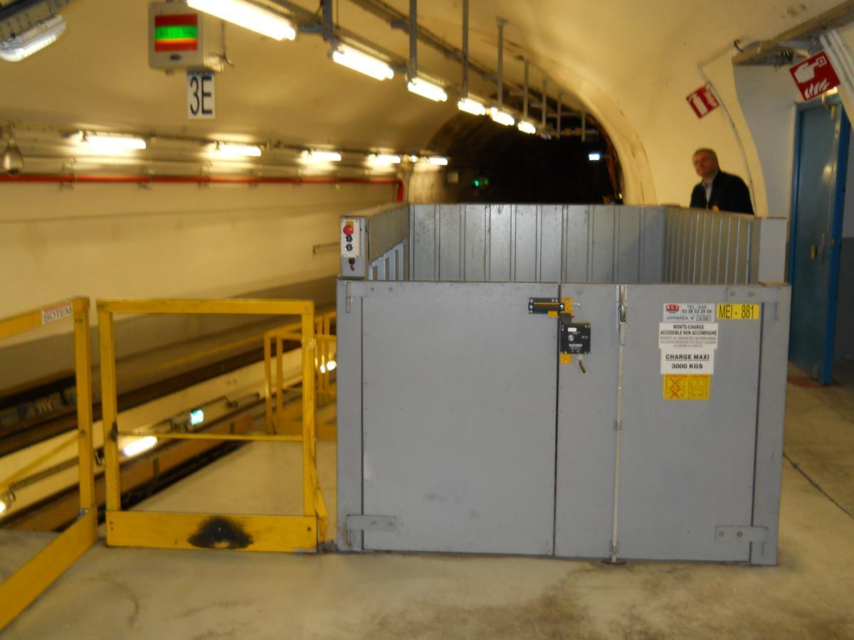 Une autre vue du système utilisé pour charger et décharger le matériel Une rame était stationnée durant toute la visite uniquement afin de permettre aux visiteurs de mieux comprendre le fonctionnement de l'atelier. Mais en temps normal, une particularité due au fonctionnement automatique de la ligne est qu'une rame stationnée peut repartir à tout moment, si le PCC le décide. Chaque personne intervenant sur la rame doit donc, avant de franchir les barrières visibles sur les clichés précédents, retirer une clé dans le boîtier de gauche (écriteau "Consignation de la position de garage") pour interdire le départ de la rame. Le réfectoire. L'atelier emploie deux personnes de 6 heures à 20 heures du lundi au vendredi et de 6 heures à midi le samedi. La visite se tenant le samedi après-midi, le guide et les accompagnateurs étaient donc le seul personnel de la RATP présent. Monte-charge pour descendre du matériel (pneu…) au niveau de la voie. À droite, le nouveau couloir d'accès ; au fond, la boucle. Au-dessus de la rame, on distingue la passerelle de l'ancien accès pour le public. Accès à la fosse Accès à la fosse et vue vers la boucle Porte du couloir vers l'atelier depuis les accès ouverts au public de la nouvelle station Porte Maillot- Ligne 1 du métro de Paris : l'atelier de la Porte Maillot - Portes ouvertes lors des journées européennes du patrimoine - Samedi 14 septembre 2013