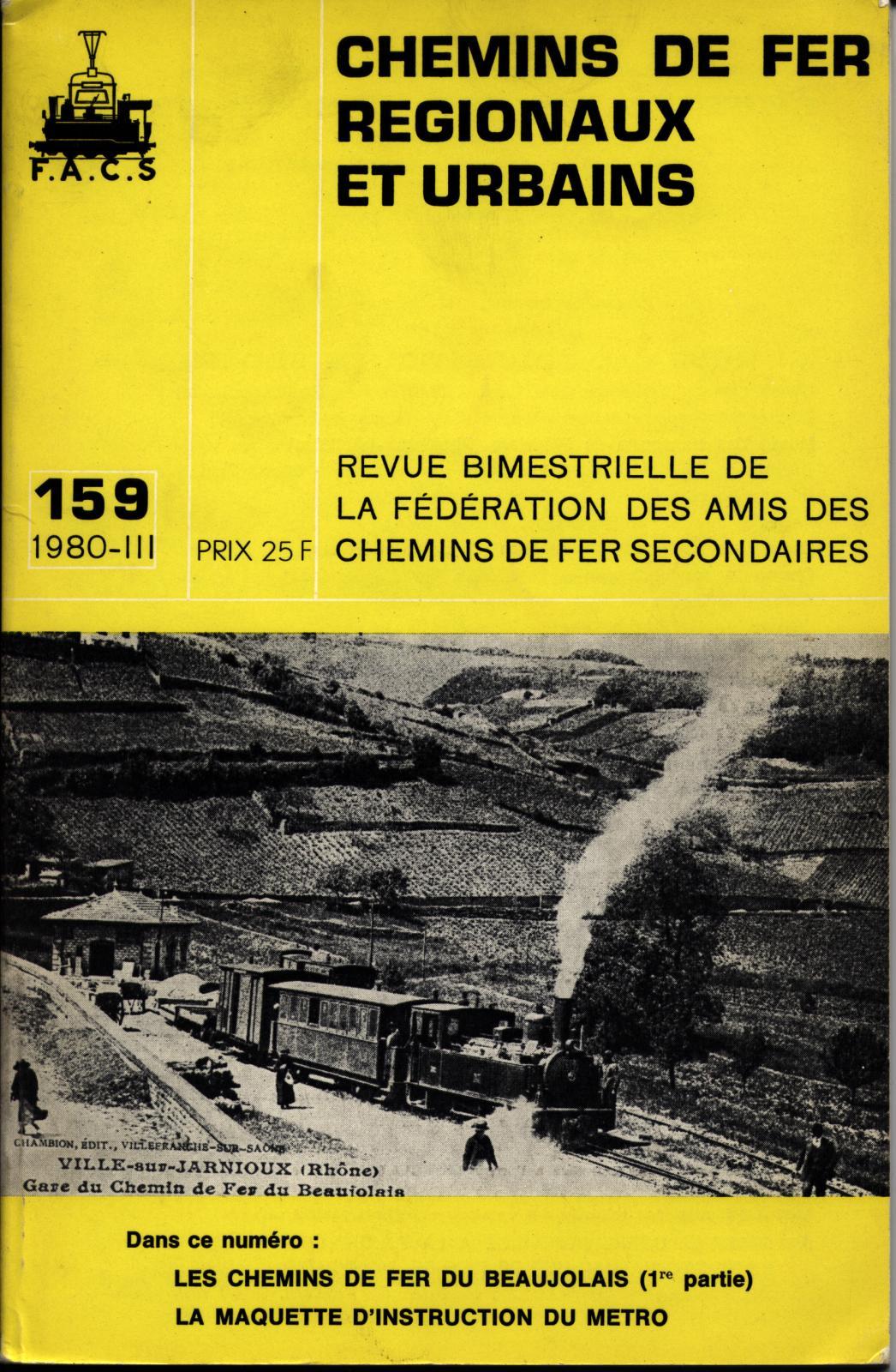 3. Je commence ce sujet pour combler une lacune (à mon sens gravissime) dans le genre les chemins de fer oubliés. J'ai exhumé de mes archives les numéros de la revue de la FACS qui lui sont consacrés (159 et 160 de 1980). Ce chemin de fer à voie étroite reliait Villefranche sur Saône à Tarare d'un côté et Monsols de l'autre, d'où partaient deux lignes l'une en direction de La Clayette et l'autre en direction de Cluny. Je ne publie pas pour l'heure de scans des images de la revue, faute de savoir, sous quelles conditions elles pourraient être publiées ici... Je vais demander à la FACS si c'est possible, en tout cas je joins un lien sur son site, page des chemins de fer secondaires du Rhône...http://www.trains-fr.org/facs/lig69.htm Couverture du numé 159 de la revue de la FACS: Ce chemin de fer vous emmenait de Villefranche à Tarare en passant par :Gleizé, Liergues, Pouilly le Monial, Jarnioux, Ville sur Jarnioux, Theizé, Frontenas, Le Bois d'Oingt, Légny, (croisement avec la ligne PLM Paray le Monial Lyon), Les Tuileries, Sarcey, les Olmes, Pontcharra sur Turdine et Tarare. Vers Monsols on visite le Beaujolais viticole avec ST Julien, Blacé, Salles-Arbuissonnas, Le Pérréon-Vaux en Beaujolais (Clochemerle!), St Etienne les Oullières, Odenas, Brouilly, Quincié, Beaujeu (terminus de la ligne PLM Belleville/Saône-Beaujeu) où l'on quitte le Beaujolais viticole pour entrer dans des paysages de prairies et de forêts pour atteindre Les Ardillats, Chénelette et enfin Monsols avec une halte au col de Crie. À suive...