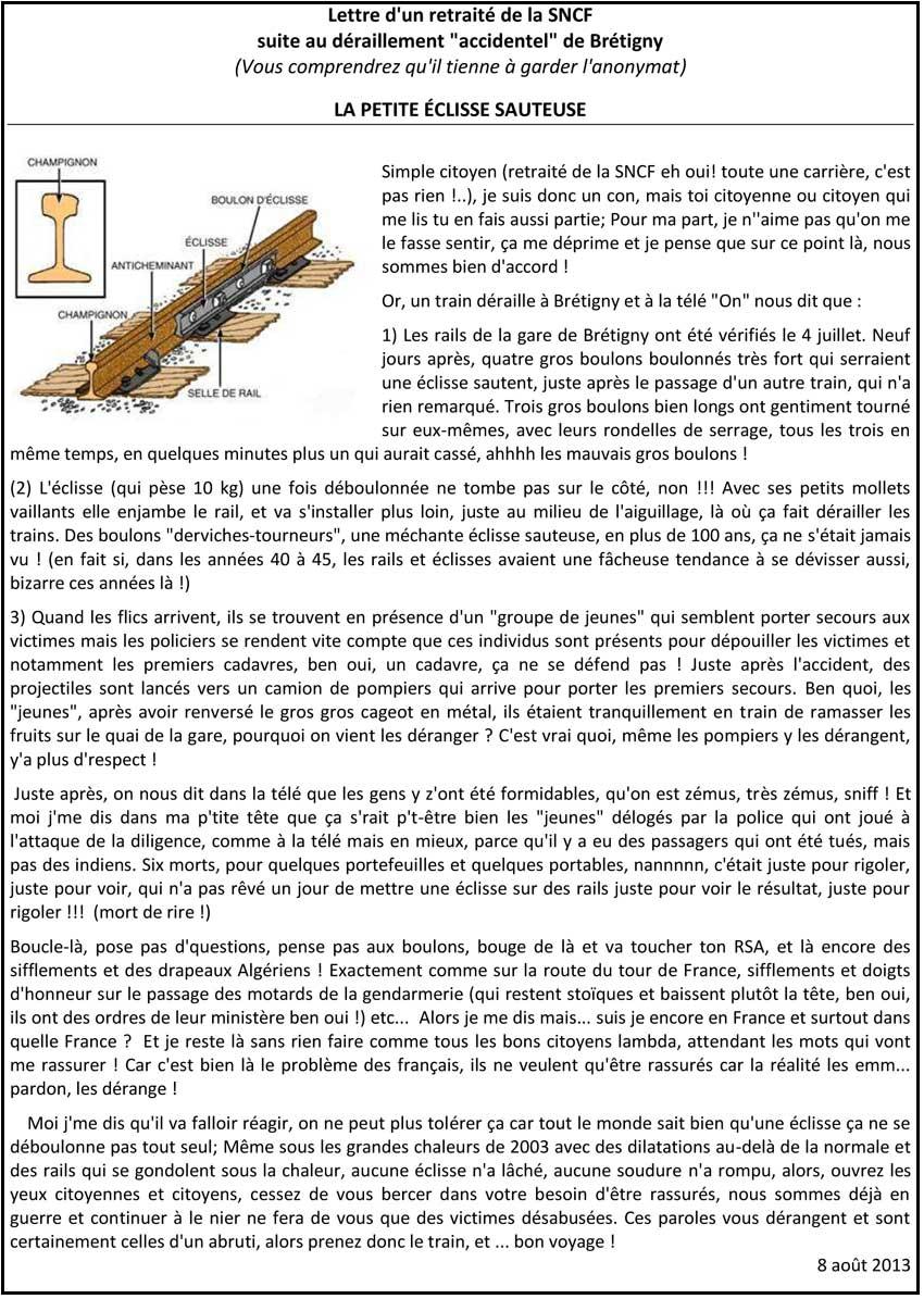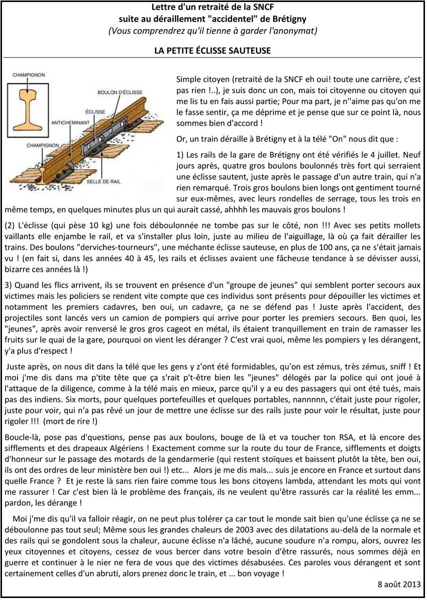 3. Retour du complot sur le courrier Internet : Aprés AZF, Brétigny: Il ne peut s'agir, bien sûr, que de hasards malencontreux. Les enquêtes officielles s'enlisent: Il ne faut surtout stigmatiser personne. Voici ce qu'en dit un retraité de la SNCF, dans un style dont se régalerait L.F. Céline! Bien entendu la Justice et le BEA-TT roupillent et comprennent rien à rien... Les beaufs sévissent!