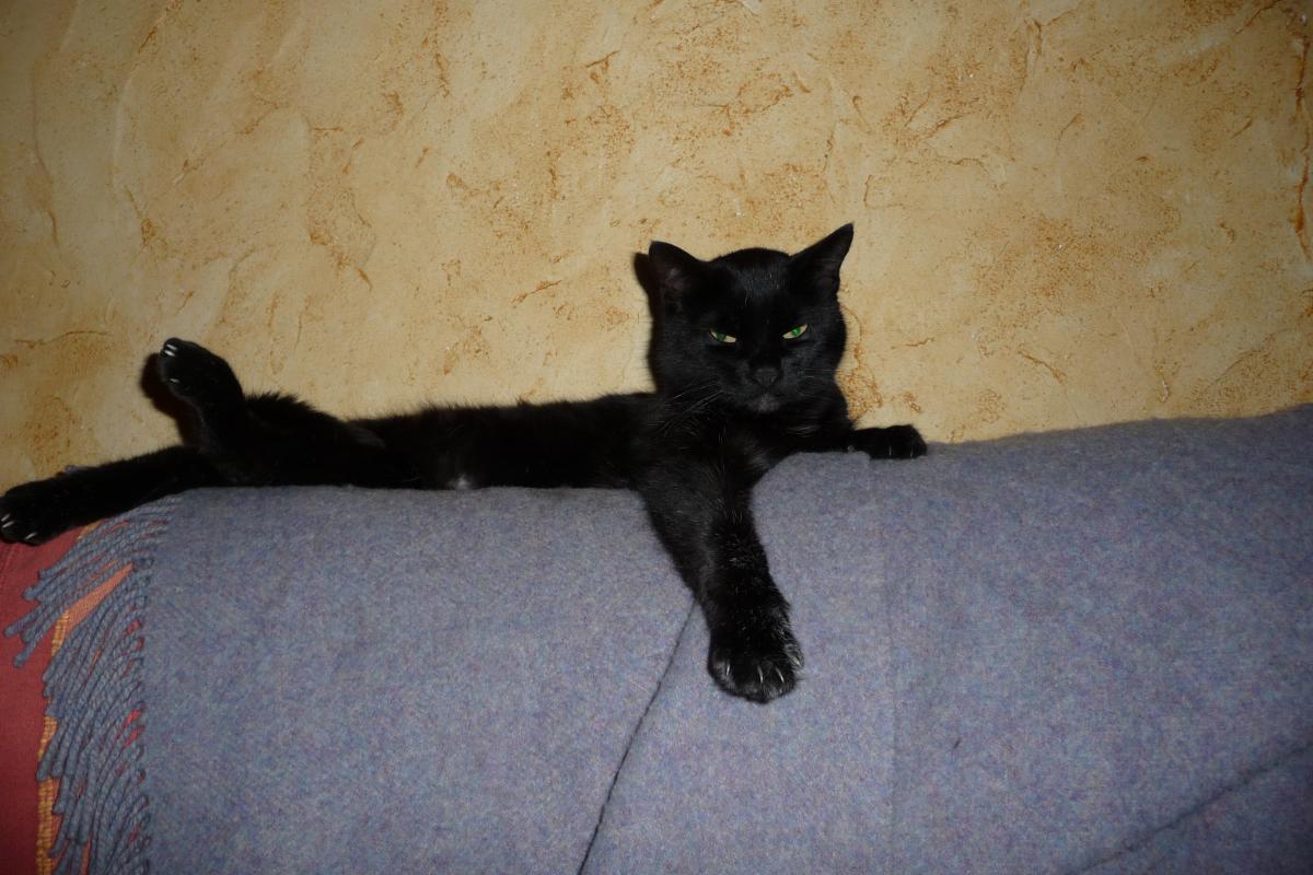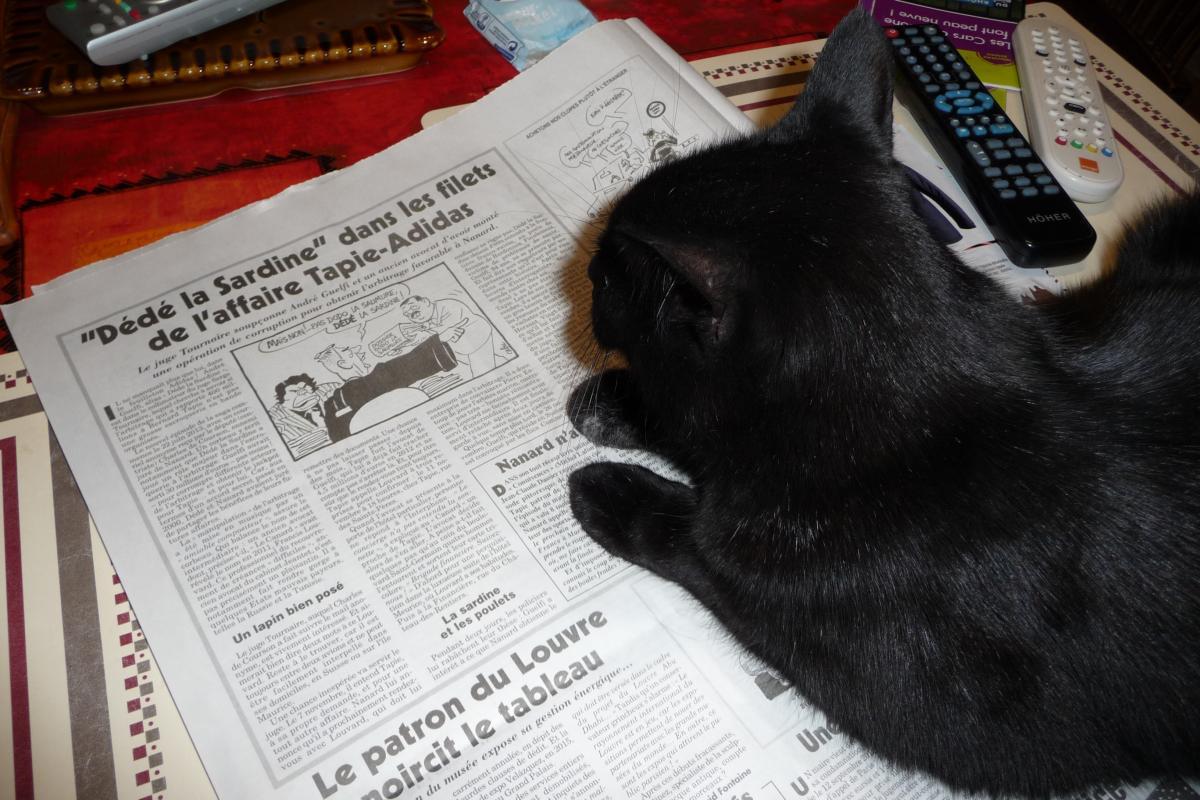 Mon chat est un lecteur assidu du Canard (quoiqu'il le préfère laqué!) Laissez-moi tranquille, je suis trop bien sur le dossier du canapé! Pauvre chien! Va-t-on le laisser manger? Oui, miam! Je m'aperçois que la photo est mal orientée mais tant pis, j'assume