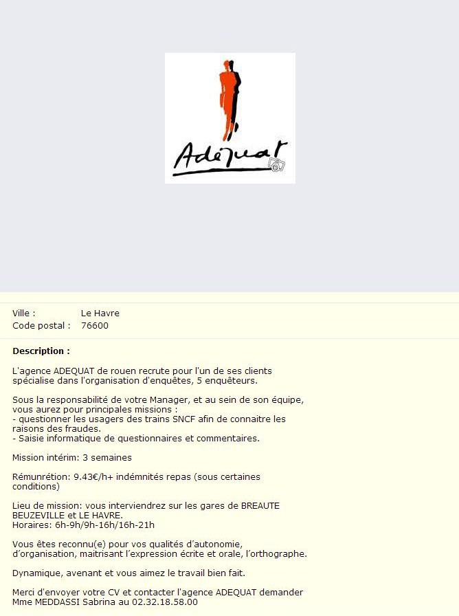 Trouvé cette annonce assez particulière, datée du 3 janvier 2013, sur le Boncoin : http://www.leboncoin...971.htm?ca=11_s L'agence ADEQUAT de Rouen recrute pour l'un de ses clients spécialisé dans l'organisation d'enquêtes, 5 enquêteurs. Sous la responsabilité de votre Manager, et au sein de son équipe, vous aurez pour principales missions : - questionner les usagers des trains SNCF afin de connaitre les raisons des fraudes. - Saisie informatique de questionnaires et commentaires. Mission intérim: 3 semaines Il me semblait tout simplement que la raison de la fraude était de profiter gratuitement d'un service ou d'un produit. Apparemment ce n'est pas seulement ceci ! La durée de la mission est de 3 semaines tout de même.