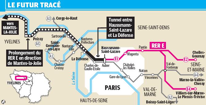 L'article du Parisien du 7.07.2010 Mantes attend le RER E pour 2020 Le débat public sur le projet de RER E entre Paris et Mantes-la-Jolie commence aujourdhui. Lenjeu : transporter plus de 500 000 voyageurs par jour dici à dix ans. Feu vert pour le prolongement du RER E vers Mantes-la-Jolie. La commission nationale du débat public doit lancer aujourdhui la première phase de ce vaste chantier en autorisant lorganisation dun débat public. Cinq cent mille bulletins seront ainsi tractés dans les gares pour informer les voyageurs. Le débat public se tiendra entre le 1 e r octobre et le 19 décembre dans une dizaine de communes situées entre Paris et Mantes-la-Jolie, précédant les travaux qui devraient démarrer en 2013. Eole remplacera le train Le projet de prolongement consiste à déplacer le terminus du RER E depuis Saint-Lazare vers Mantes-la-Jolie et de desservir par RER la plupart des gares situées entre Paris et Mantes. Dès 2020, les RER remplaceront donc les trains omnibus sur la ligne Paris-Mantes par Poissy. A noter que les directs continueront de fonctionner. Un tunnel entre Paris et la Défense La longueur des travaux sexplique en grande partie par la réalisation dun tunnel de presque neuf kilomètres entre la capitale et La Défense. Trois options sont à létude : un trajet direct Paris-La Défense, un autre avec « escale » à Porte de Clichy et enfin un troisième avec desserte de la porte Maillot. Cette dernière option tiendrait la corde. Des trains plus nombreux Il faut aujourdhui près dune heure pour rejoindre en bus la Défense depuis Mantes-la-Jolie. En 2020, ce trajet sera rapporté à 38 min. Sur les lignes Paris-Mantes, le gain de temps devrait se limiter à près de 7 min. Les rames seront plus nombreuses et embarqueront plus de passagers. Cette offre conséquente permettra de répondre aux besoins de 180 000 voyageurs de ce tronçon attendus chaque jour en 2020, qui sajouteront aux 360 000 usagers actuels qui empruntent les tronçons entre Paris et la Seine-et-Marne. Le bouchon de Villennes ne saute pas Les habitués du Paris-Mantes y sont confrontés régulièrement : il existe à hauteur de Villennes-sur-Seine un goulot détranglement où les trains ne circulent plus que sur une voie. Une situation qui est à lorigine de nombreux problèmes mais que larrivée dEole ne réglera pas. Des voies de dépassement devraient tout de même être construites entre Mantes et Epône. Attention risque de confusion : il y a 2 voies http://www.leparisien.fr/yvelines-78/mantes-attend-le-rer-e-pour-2020-07-07-2010-991967.php