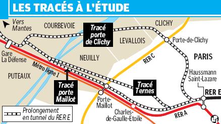 Un article du Parisien du 29.06.2010 : Trois scénarios envisagés pour prolonger Eole Très attendu par les salariés du quartier d’affaires, le prolongement du RER E à l’ouest se précise.Un débat public sera organisé à partir d’octobre Il concerne quelque 3,5 millions de personnes, mettra Mantes-la-Jolie (Yvelines) à trente-cinq minutes de La Défense au lieu de cinquante-cinq et désengorgera la ligne du RER A. Le prolongement d’Eole à l’ouest de Paris est presque attendu comme le messie, d’autant que, malgré la crise, de nouvelles tours (First, Carpe Diem) pointent le bout du nez dans le ciel de La Défense et vont déverser dans les rames de RER et de train des milliers de passagers supplémentaires dès l’an prochain. Un débat public à l’automne. Après les études réalisées ces dernières années, le prolongement d’Eole à l’ouest va franchir une nouvelle étape cet automne avec le lancement du débat public. Une procédure mise en place en raison du coût du projet : entre 2,2 Mds€ et 2,8 Mds€ selon le tracé. Le débat devrait avoir lieu entre le 1er octobre et le 19 décembre sous la forme d’une dizaine de réunions publiques organisées dans les villes situées le long du tracé (Paris, La Défense, Nanterre, Houilles…). Les travaux devraient démarrer en 2013 et la mise en service de la totalité du parcours est espérée pour 2020. Trois tracés en question Au départ de Paris-Haussmann, un tunnel sera creusé jusqu’à La Défense, puis la ligne E sortira en aérien jusqu’au secteur des Groues à Nanterre pour rejoindre le réseau existant (ligne J, Paris-Saint-Lazare à Mantes-la-Jolie). Trois hypothèses ont été étudiées pour ce tunnel. Un tracé direct (7,8 km) qui passe sous la place des Ternes, traverse Neuilly au nord de la N 13, puis la Seine au niveau du pont de Neuilly. Un autre tracé (7,9 km) passe par la porte Maillot et permet une connexion avec le RER C, puis poursuit via Neuilly et le pont de Neuilly jusqu’à La Défense. Le troisième (9,4 km) remonte vers le nord jusqu’à la porte de Clichy (connexion RER C, métros 13 et 14), passe sous Clichy, Levallois, l’île de la Jatte et Courbevoie jusqu’à La Défense. Même si les trois parcours seront présentés au débat, le plus long (donc le plus cher) n’a guère de chance d’être retenu. Reste la discussion sur l’intérêt d’un arrêt porte Maillot. Certains regrettent que cet arrêt rallonge le temps de parcours entre Paris et le quartier d’affaires, laissant la première place en termes de rapidité au RER A. Quelle gare à La Défense ? La localisation de la gare sous le quartier d’affaires n’a pas été définitivement retenue : sous le Cnit, sous le boulevard circulaire (côté Courbevoie) ou sous les allées Gambetta (Courbevoie). Mais les liaisons directes avec le pôle multimodal Cœur Transports est une priorité. La future gare de la Folie à Nanterre, dans le secteur d’activités des Groues, accueillera Eole, mais aura-t-elle des quais pour recevoir l’éventuel TGV Paris-Normandie? La question ne sera pas tranchée à l’automne, d’autant moins que le débat public sur le TGV Normandie ne devrait avoir lieu, lui, qu’à l’automne 2011. http://www.leparisien.fr/hauts-de-seine-92/trois-scenarios-envisages-pour-prolonger-eole-30-06-2010-982985.php