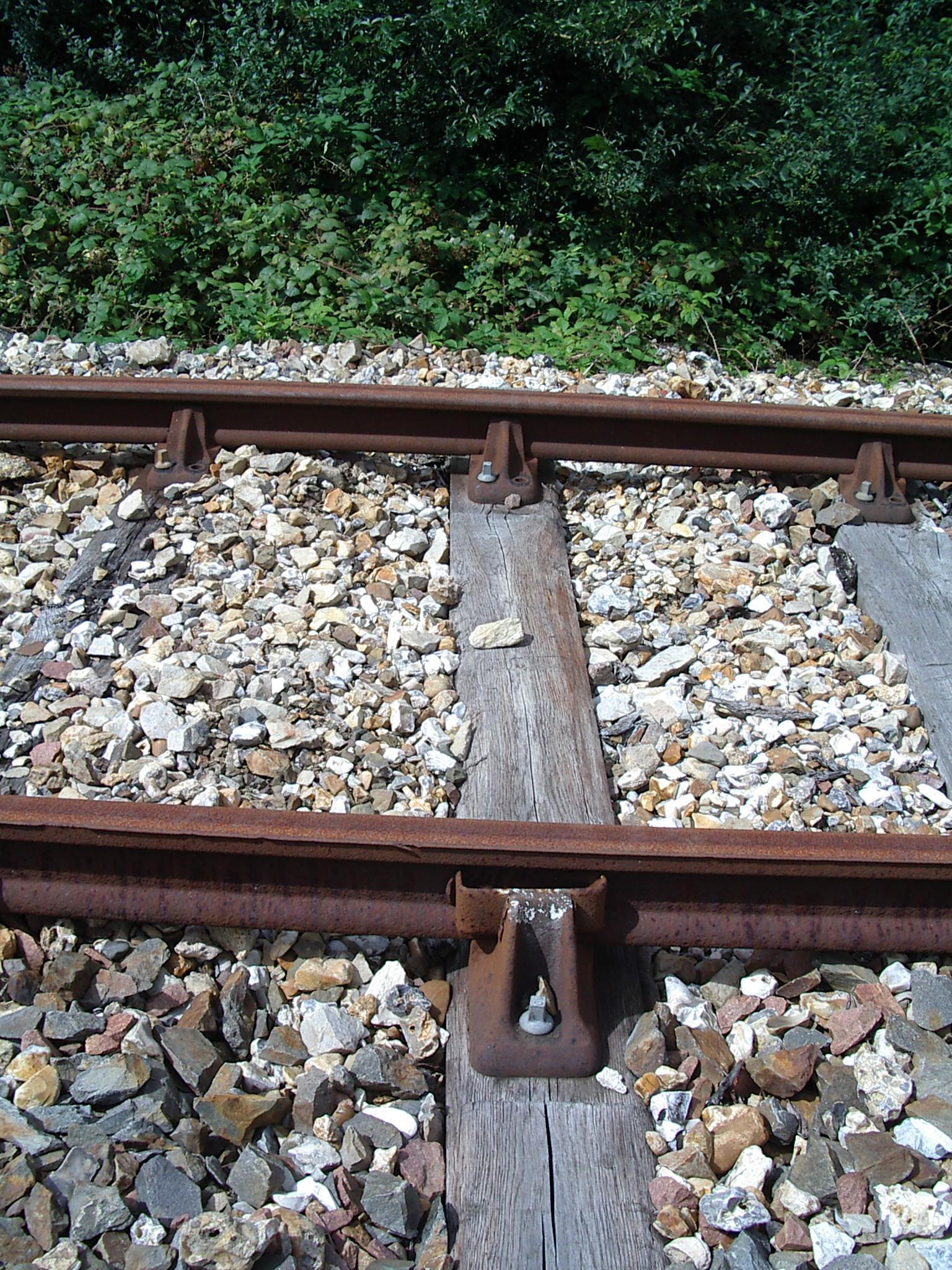 Savez vous qu'un rail a une âme ? La constitution du rail vignole : un patin c'est la base du rail qui repose sur la traverse ; au dessus c'est l'âme qui supporte le champignon. Je ne vous ai rien appris sans doute. Le rail double champignon était une invention des anglais. Le rail est posé sur des coussinets en fonte et maintenu par des coins. L'idée des anglais était de retourner le rail lorsque le champignon supérieur était usé. L'intérêt était bien sûr économique. Ce qui n'était pas prévu c'est qu'une usure par encochage du champignon inférieur sur le coussinet se produit. Du coup ça n'a pas marché le fait de retourner le rail. Il reste encore pas mal de voies même avec circulations de train voyageurs avec ce type de pose. Photo à l'appui :