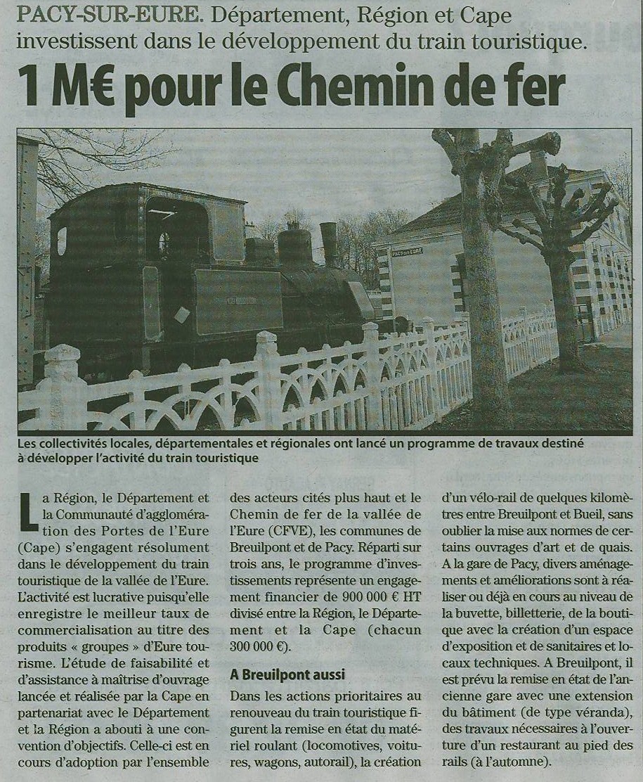 un sujet a été posté par kerguel dans Chemins de fer touristiques, Musées, préservation du patrimoine ferroviaireLe site internet du CFVE : http://www.cfve.org/index.php Des budgets d'investissemnt viennent d'être accordés par 3 collectivités pour un montant global de 900 000 € HT, chacune mettant 300 000€ au pot. Il s'agit de la région Haute Normandie, du Conseil Général de l'Eure et de la Communauté d'agglomération de la porte de l'Eure (CAPE). La fréquention annuelle du train touristique est de 12000 personnes. L'article de Paris Normandie du 19 mars 2012