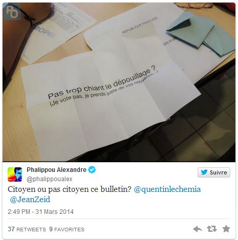 Au sujet du vote blanc, un bulletin trouvé dans une urne en Loire Atlantique : http://www.europe1.fr/Municipales/Un-bulletin-pas-trop-chiant-le-depouillage-dans-l-urne-1930681/