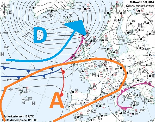 75 jours ! 75 jours de flux d'ouest, sans rien pour freiner les perturbations. Ca nous a donné un hiver doux, humide et venteux. Il fallait bien qu'un jour les anticyclones reprennent du poil de la bête, vous savez ces hautes pressions qui sont synonymes de temps sec et ensoleillé. Ca nous donne une image satellite qu'on ne voyait plus depuis longtemps. Cet hiver, nous aurions du avoir une barrière de hautes pressions venant de l'est (anticyclone de Sibérie). Elle n'est jamais venu. En cette fin d'hiver, c'est l'anticyclone des Acores (A) qui doit venir gentiment, et lui est au rendez vous. Il gonfle et vient faire une barrière à tout ce qui vient de la gauche sur l'image, donc au flot des perturbations (D) qui se forment sur l'atlantique. Et il semble qu'il soit suffisamment puissant et stable pour nous protéger pendant un petit moment. Nous allons donc assister à un phénomène de "compensation" qui fait qu'après une longue période d'un même type de temps, il arrive souvent qu'on ait une longue période de temps opposé, un peu comme si après un trop plein de quelque chose, vous faisiez régime de cette même chose, histoire d'équilibrer l'ensemble. Car n'oublions jamais : les masses d'air à l'échelle de la planète sont toutes liées et aussi l'équilibre globale est immuable. (hors réchauffement climatique)
